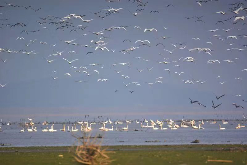 ▲近年来,随着黄盖湖水环境的不断改善,每年在黄盖湖越冬的小天鹅、雁类、野鸭等候鸟数量达2万余只,越冬候鸟总数同比持续增长,一湖碧水、群鸟齐飞的景象在黄盖湖再现
