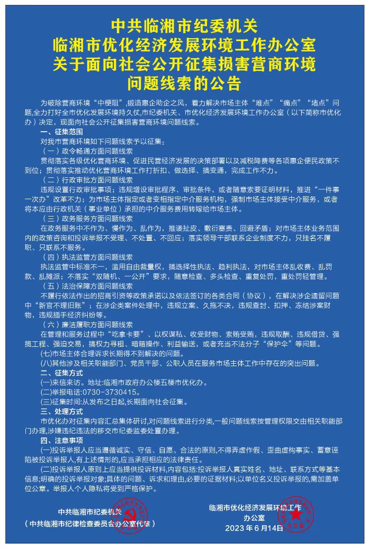 中共临湘市纪委机关 临湘市优化经济发展环境工作办公室关于面向社会公开征集损害营商环境问题线索的公告