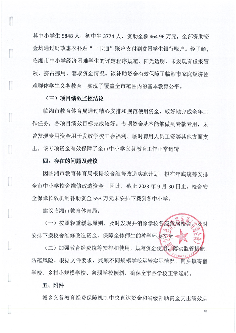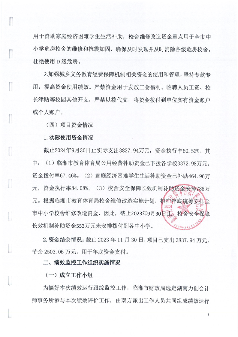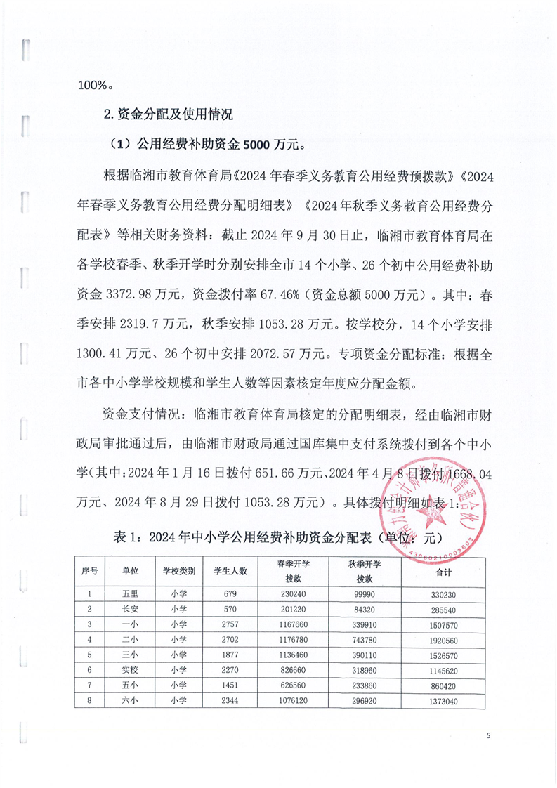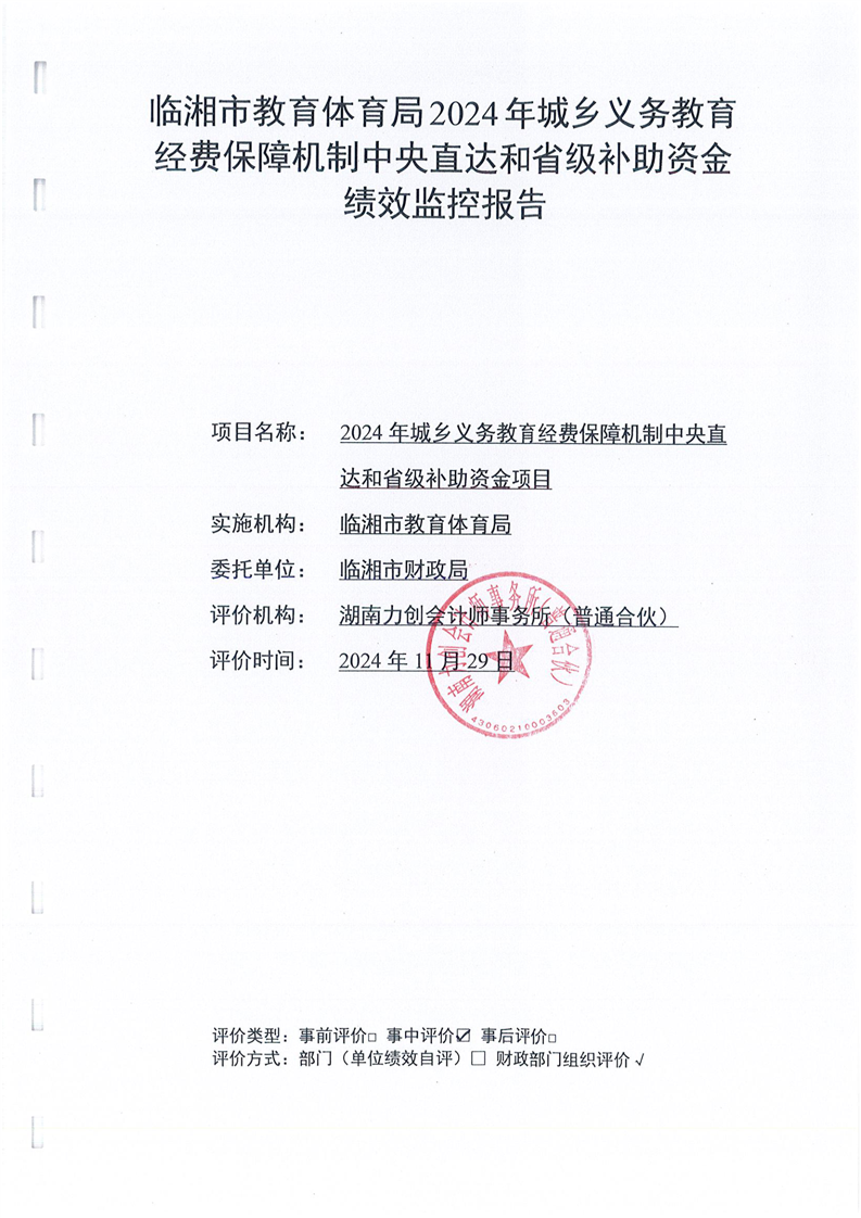 临湘市教育体育局2024年城乡义务教育经费保障机制中央直达和省级补助资金绩效监控报告
