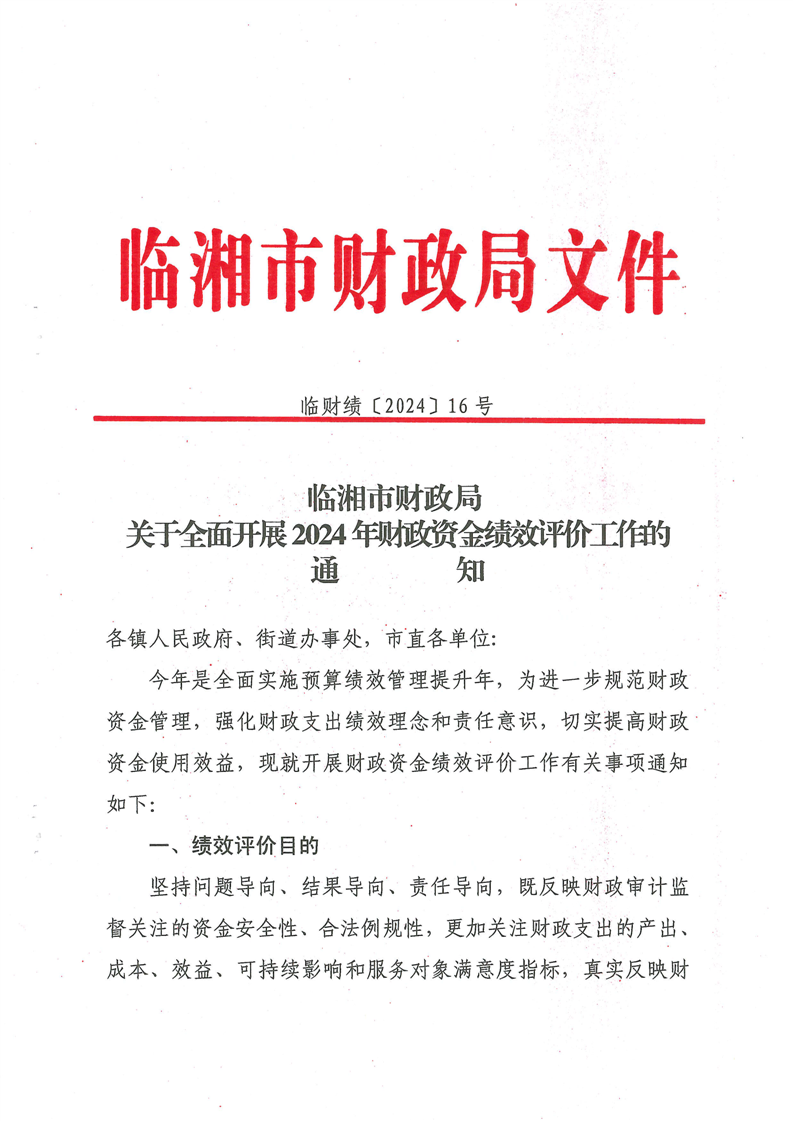 临湘市财政局关于全面开展2024年财政资金绩效评价工作的通知