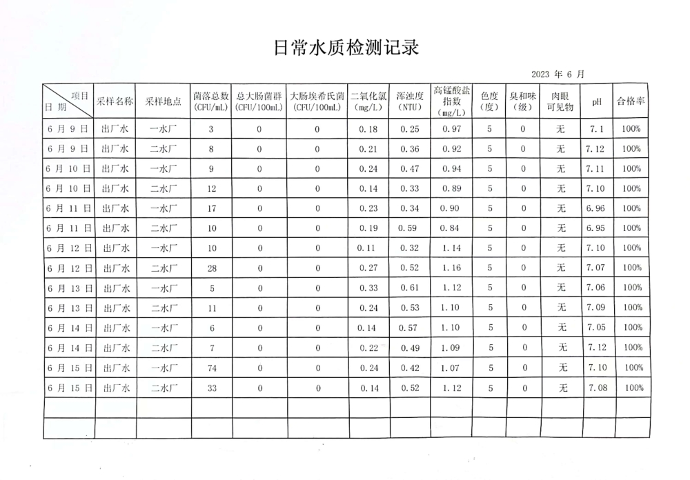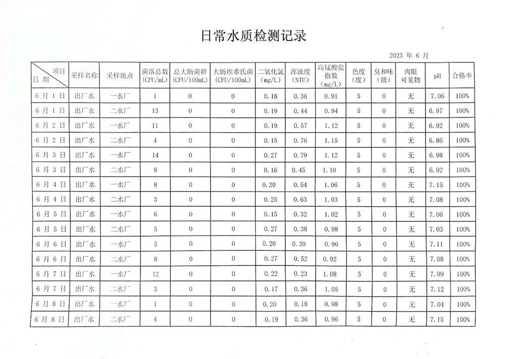 兴临自来水公司日检、半月检水质信息公开(6月上半月)