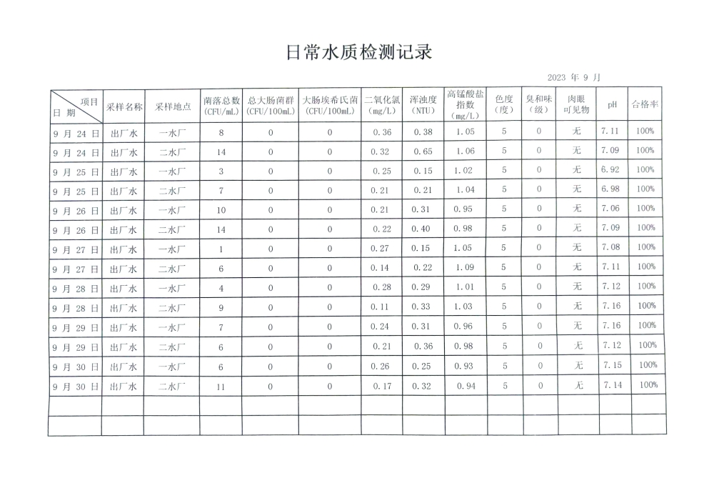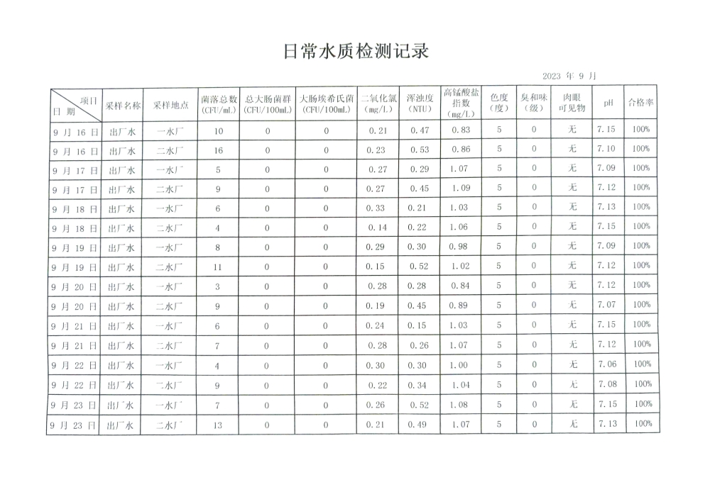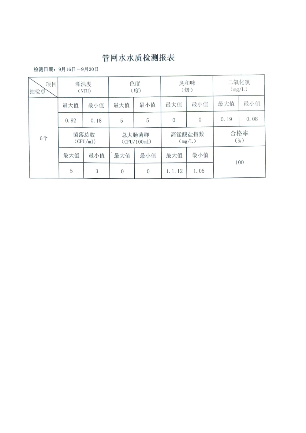 兴临自来水公司日检、半月检水质信息公开(9月下半月)