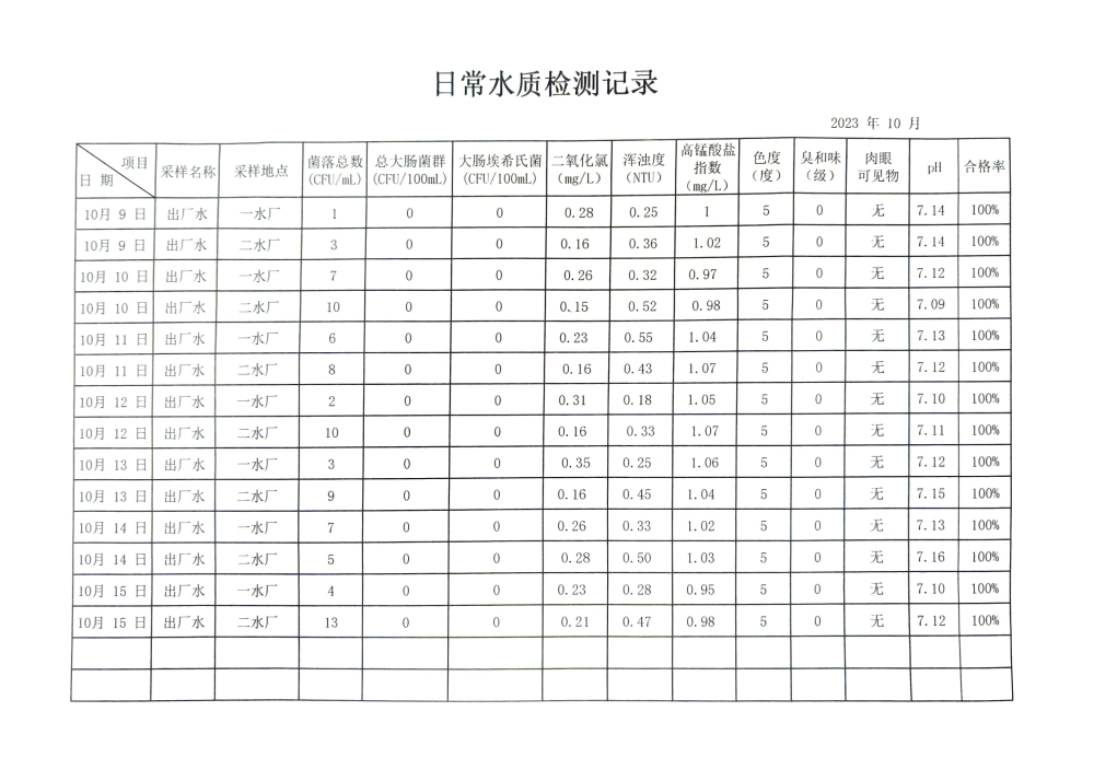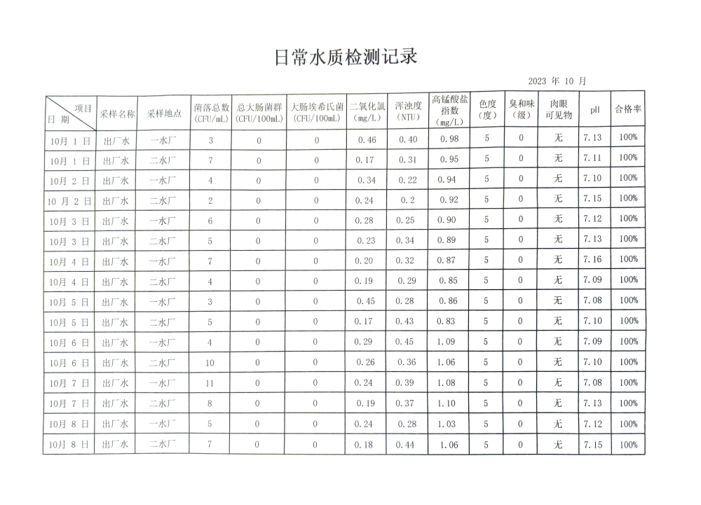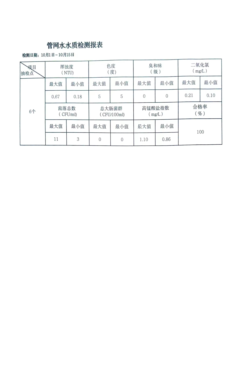 兴临自来水公司日检、半月检水质信息公开(10月上半月)
