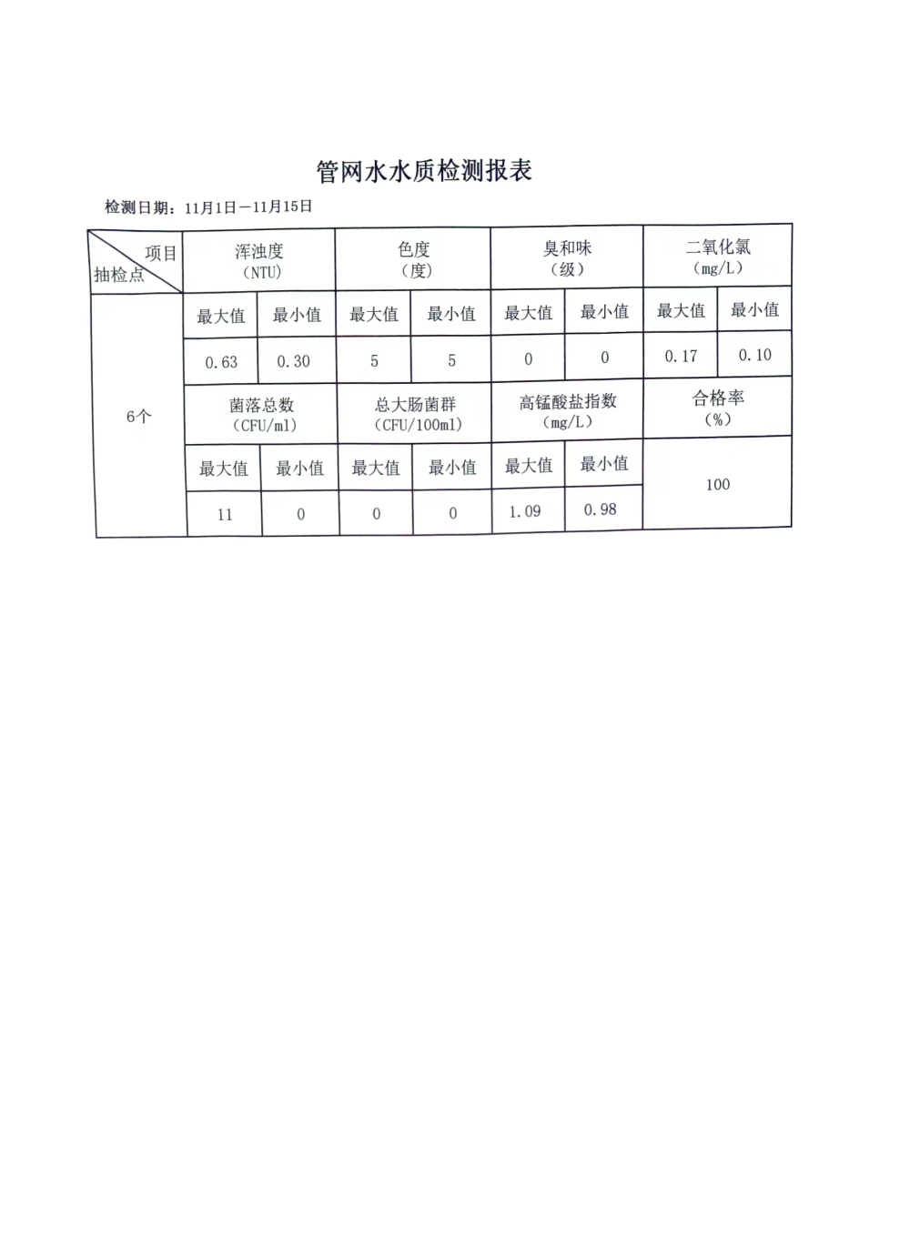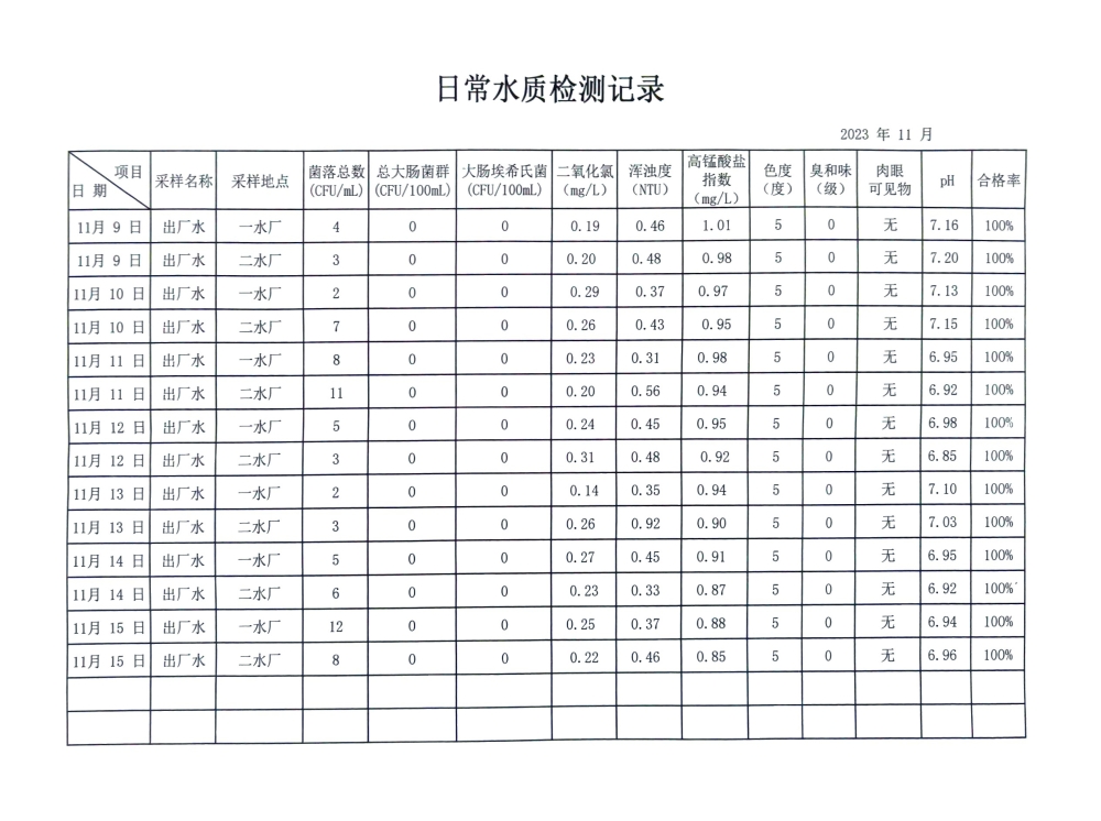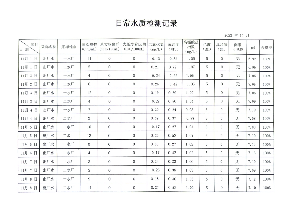 兴临自来水公司日检、半月检水质信息公开(11月上半月)