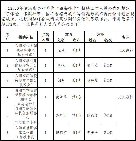 2023年临湘市事业单位“四海揽才”招聘体检人员递补公告