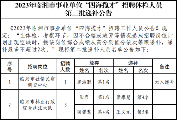 2023年临湘市事业单位“四海揽才”招聘体检人员第二批递补公告