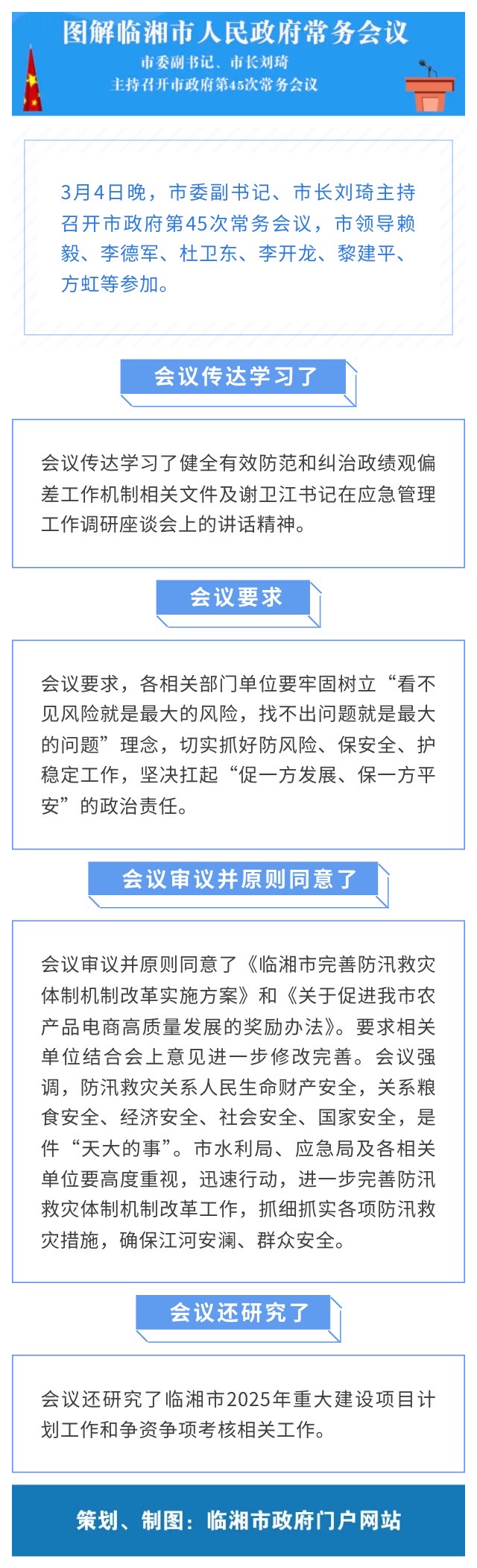 会议审议并原则同意了《临湘市完善防汛救灾体制机制改革实施方案》和《关于促进我市农产品电商高质量发展的奖励办法》。要求相关单位结合会上意见进一步修改完善。会议强调,防汛救灾关系人民生命财产安全,关系粮食安全、经济安全、社会安全、国家安全,是件“天大的事”。市水利局、应急局及各相关单位要高度重视,迅速行动,进一步完善防汛救灾体制机制改革工作,抓细抓实各项防汛救灾措施,确保江河安澜、群众安全。