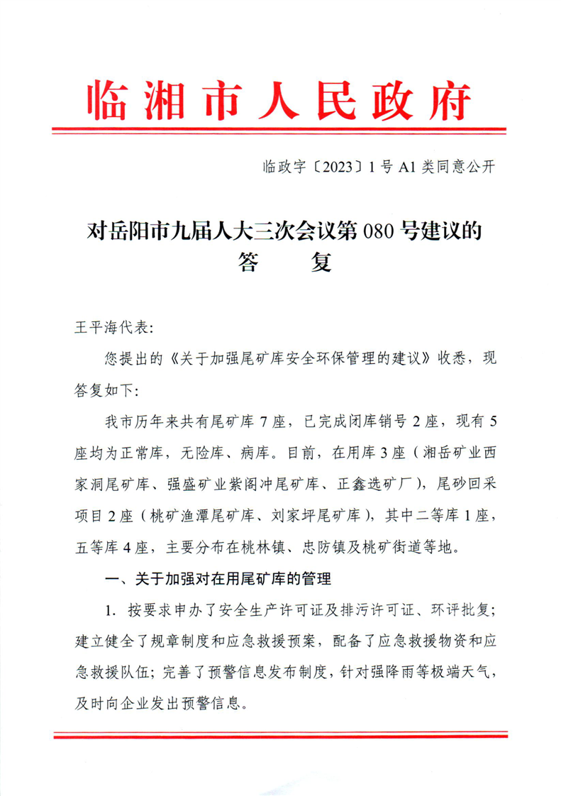对岳阳市九届人大三次会议第080号建议的答复