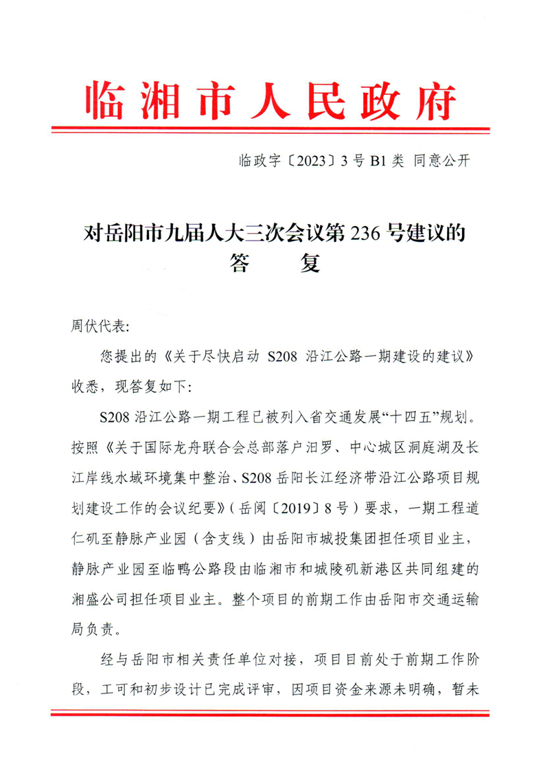 对岳阳市九届人大三次会议第236号建议的答复