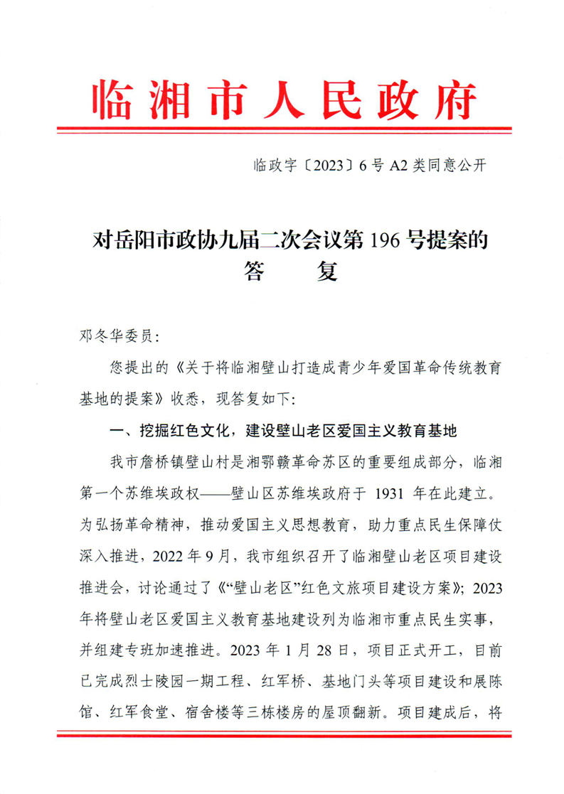 对岳阳市政协九届二次会议第196号提案的答复