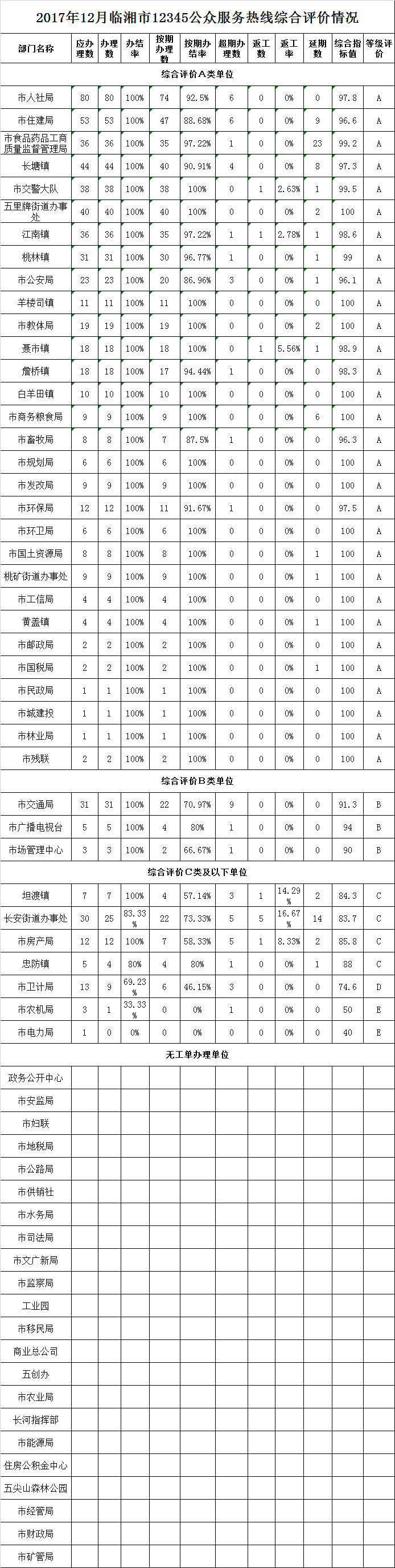 2017年12月临湘市12345公众服务热线综合评价情况