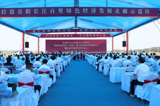 烈日炎炎,战鼓擂动。8月18日上午,我市2023年重大产业项目湖南双阳高科(岳阳)电子级双氧水项目开工暨新项目集中签约仪式在市高新技术产业开发区双阳高科项目建设地举行。15个项目集中签约、1个项目开工,总投资127亿元,预计年税收6.2亿元,为全市经济高质量发展提供强力支撑。岳阳市委副书记、市长李挚,市委常委、常务副市长李建华,市委常委、市纪委书记、市监委主任谢运策,市人大常委会副主任、党组副书记李永丰,市政协副主席、党组成员李运帷,中国诚通控股集团有限公司党委委员、副总经理李友生,中国纸业投资有限公司党委副书记、总经理钟天崎,岳阳林纸股份有限公司党委书记、董事长叶蒙,我市市委书记王文华,市委副书记、市长刘琦等市“四大家”在家领导出席活动。