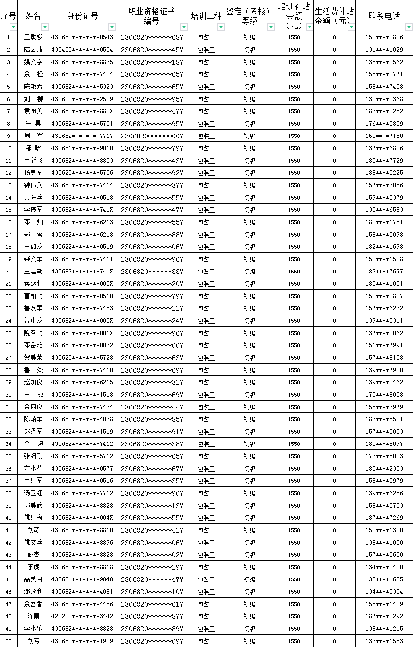 职业技能培训补贴人员名册(欣浩 、第一期包装工)