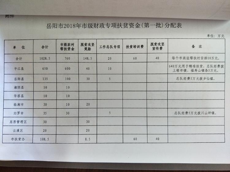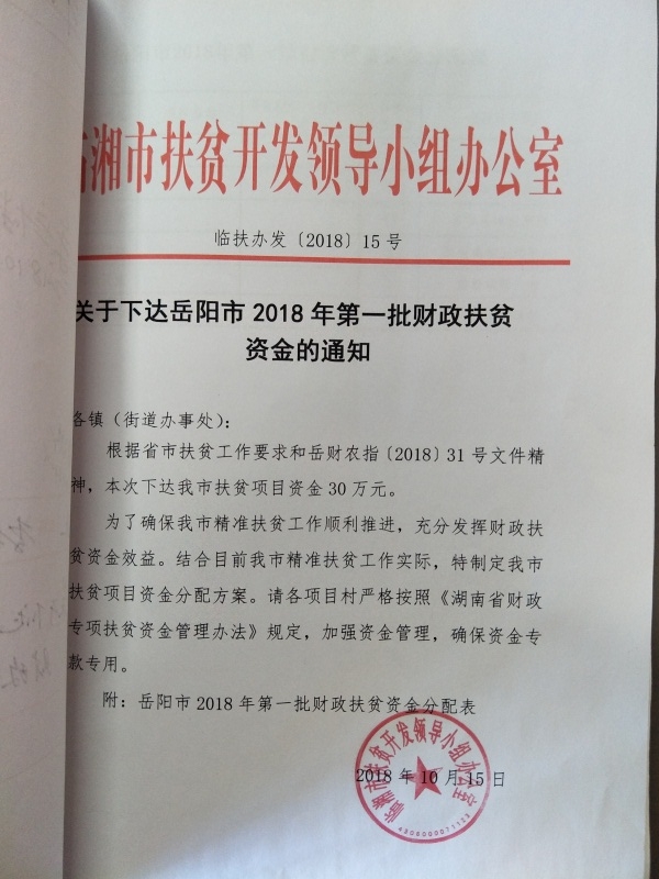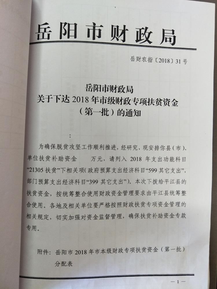 关于下达岳阳市2018年第一批财政扶贫资金的通知