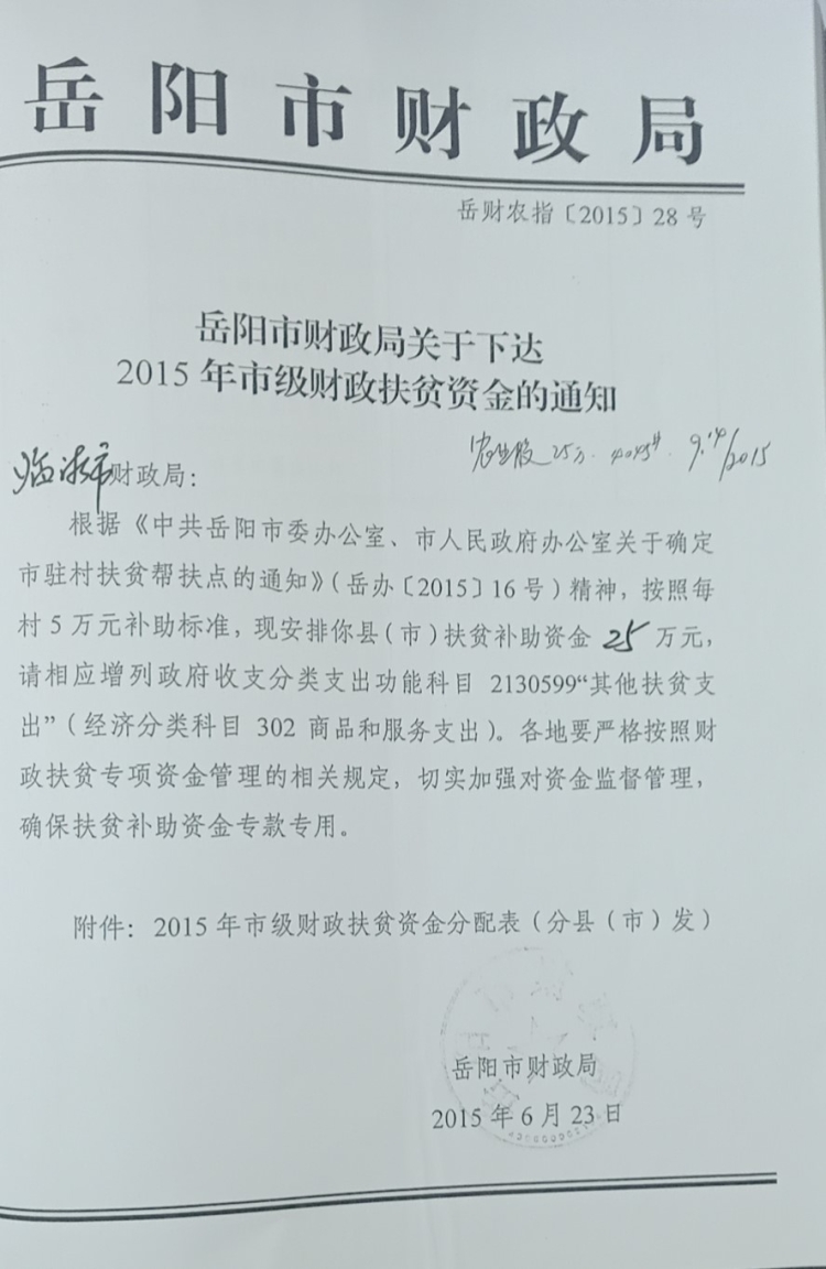 关于 下达2015年市级财政扶贫资金的通知(岳财农指[2015]28号