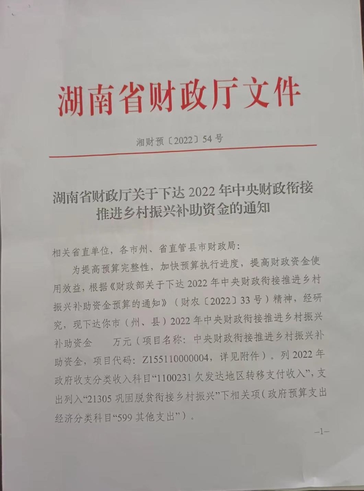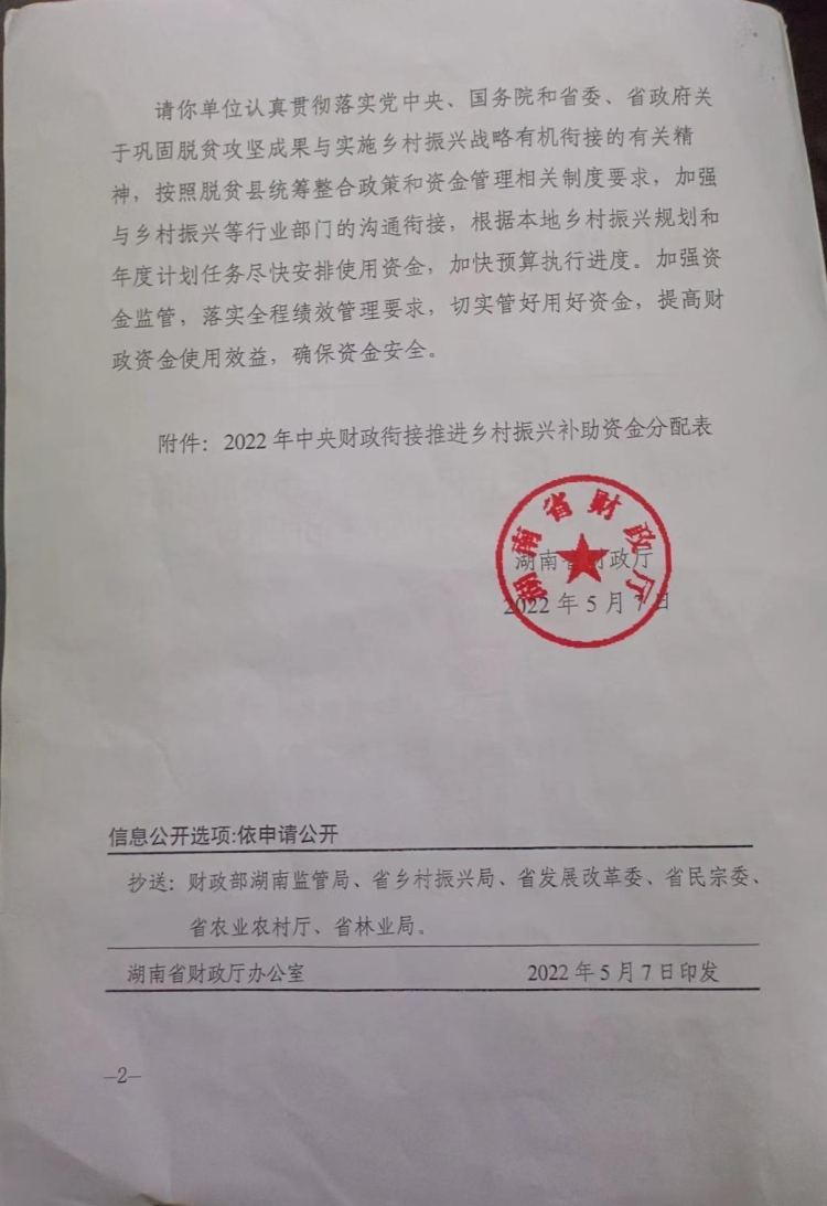 湖南省财政厅关于下达2022年中央第二批财政衔接推进乡村振兴补助资金的通知