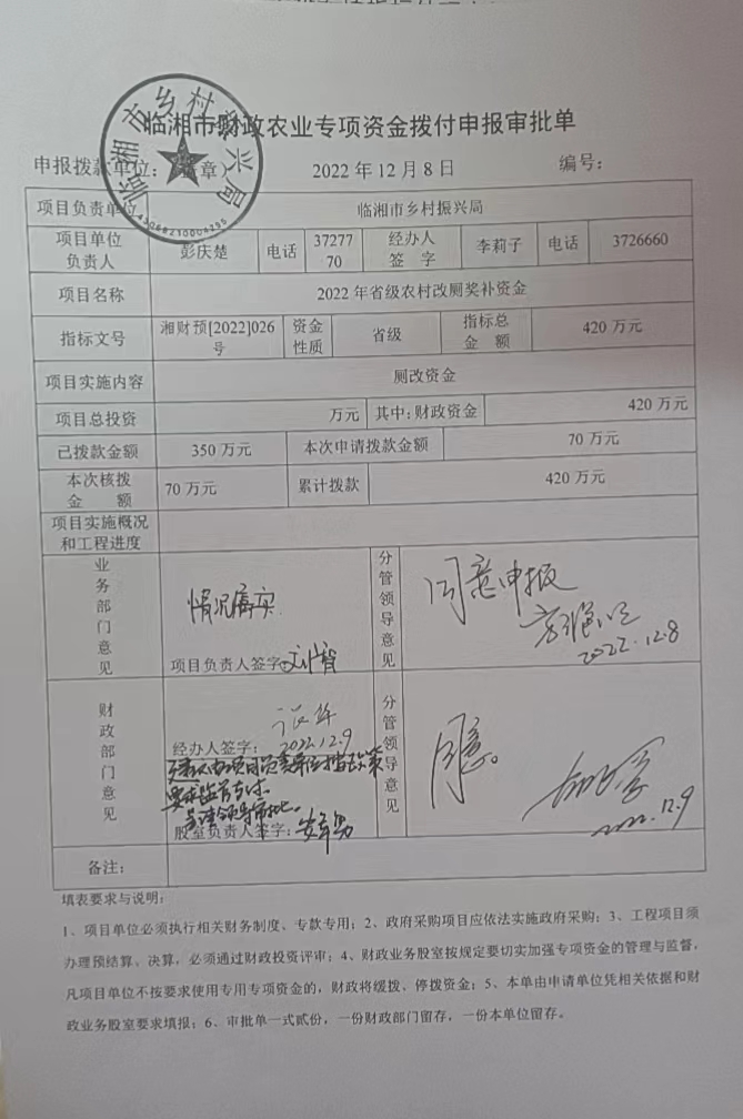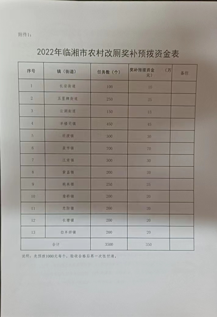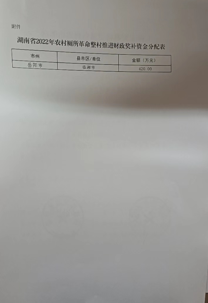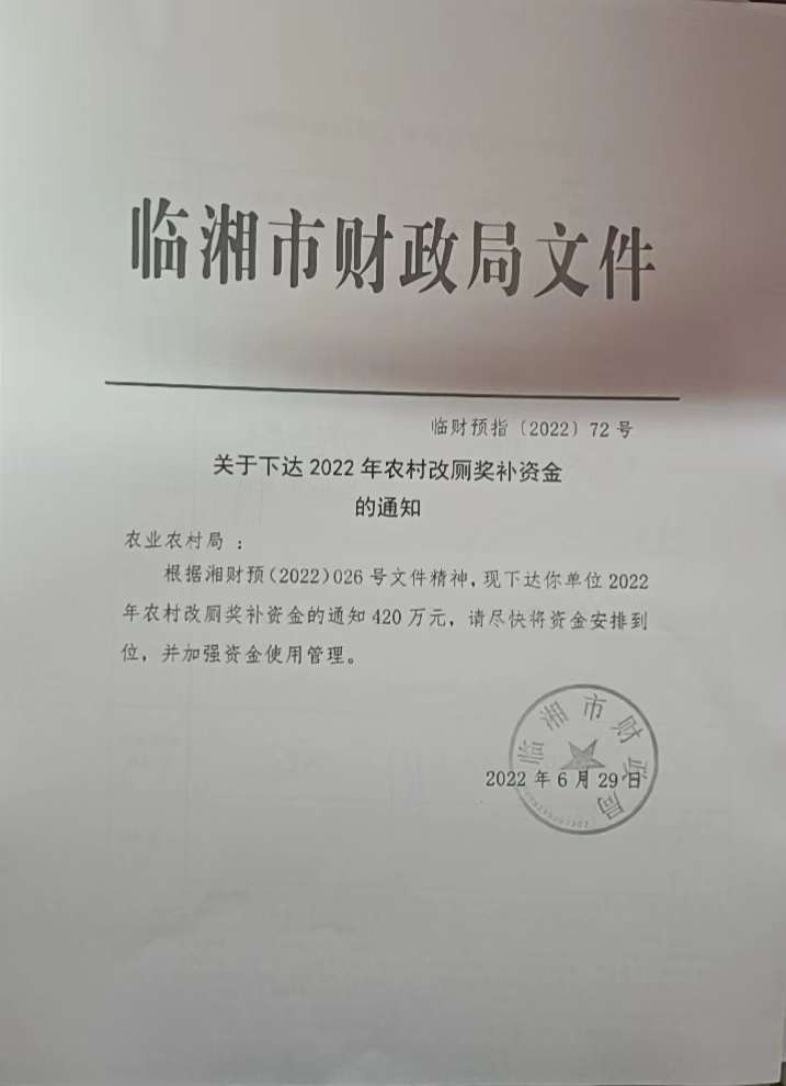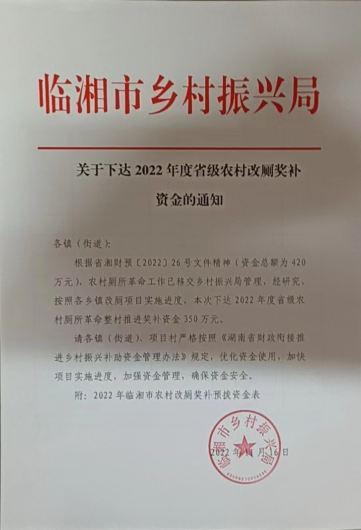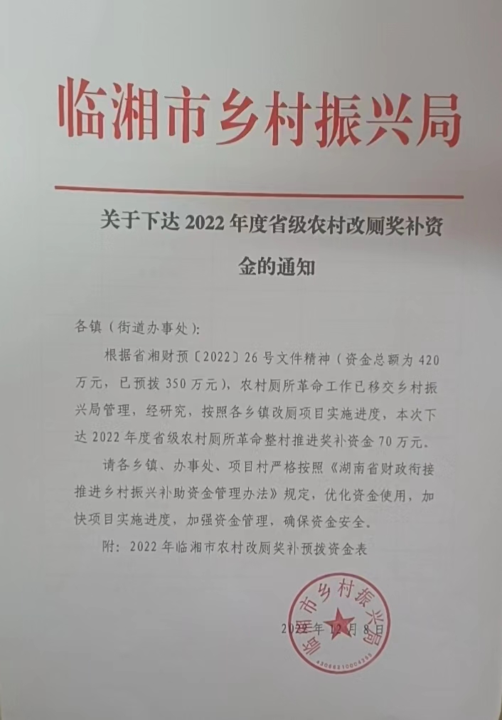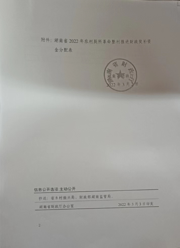 关于下达2022年农村改厕奖补资金的通知(湘财预[2022]26号)