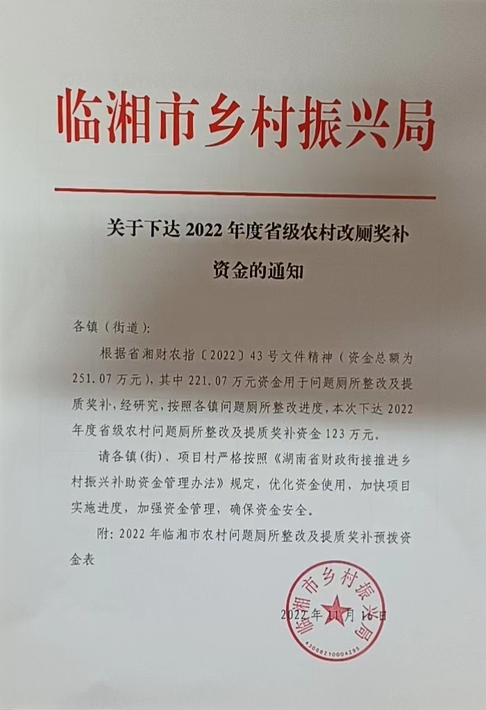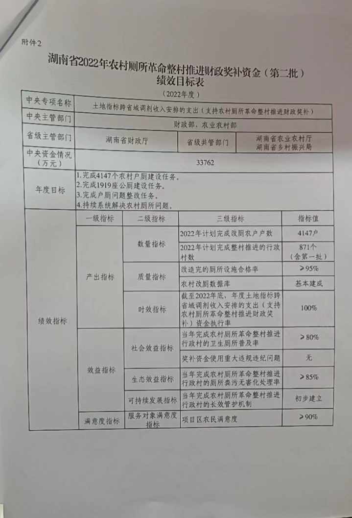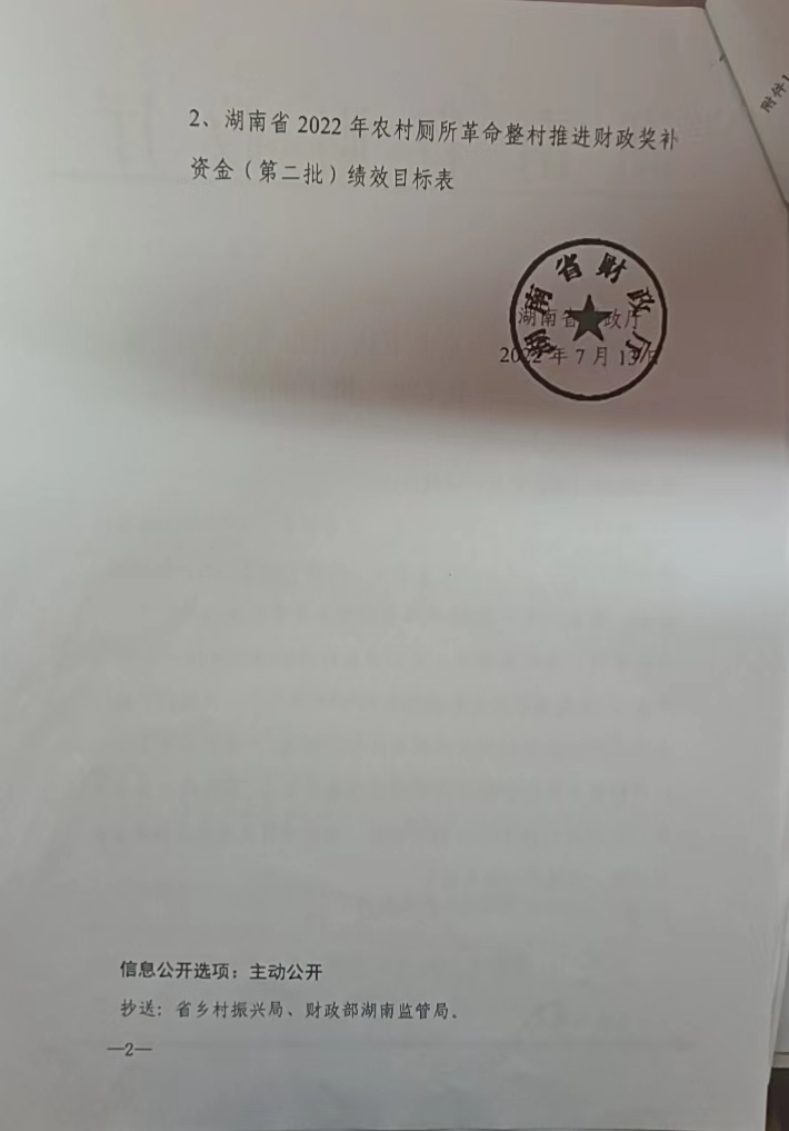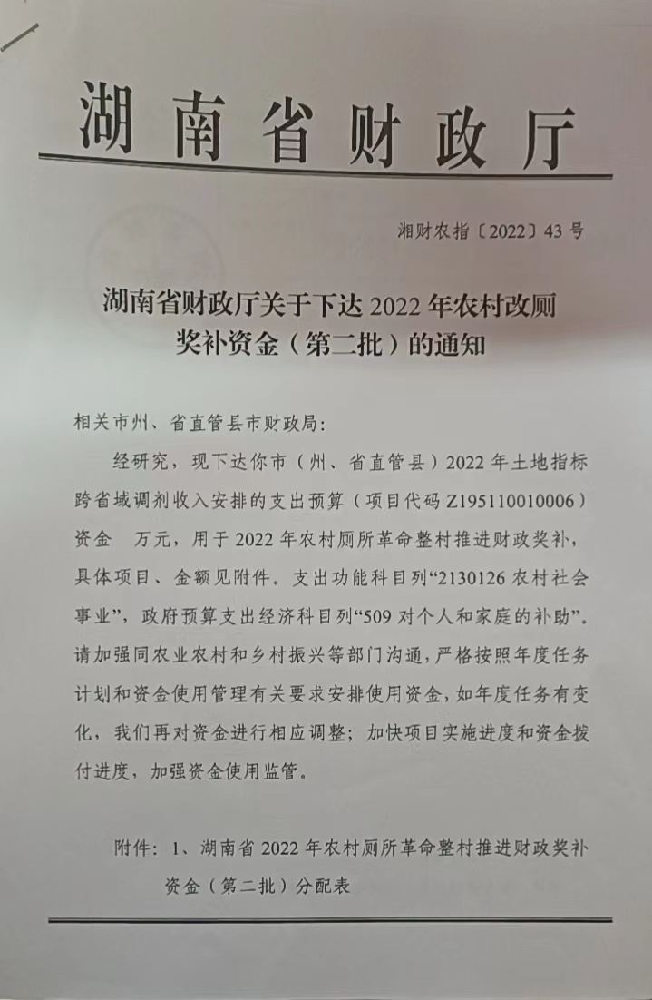 湖南省财政厅关于下达2022年农村改厕奖补资金(第二批)的通知(湘财农指[2022]43号)