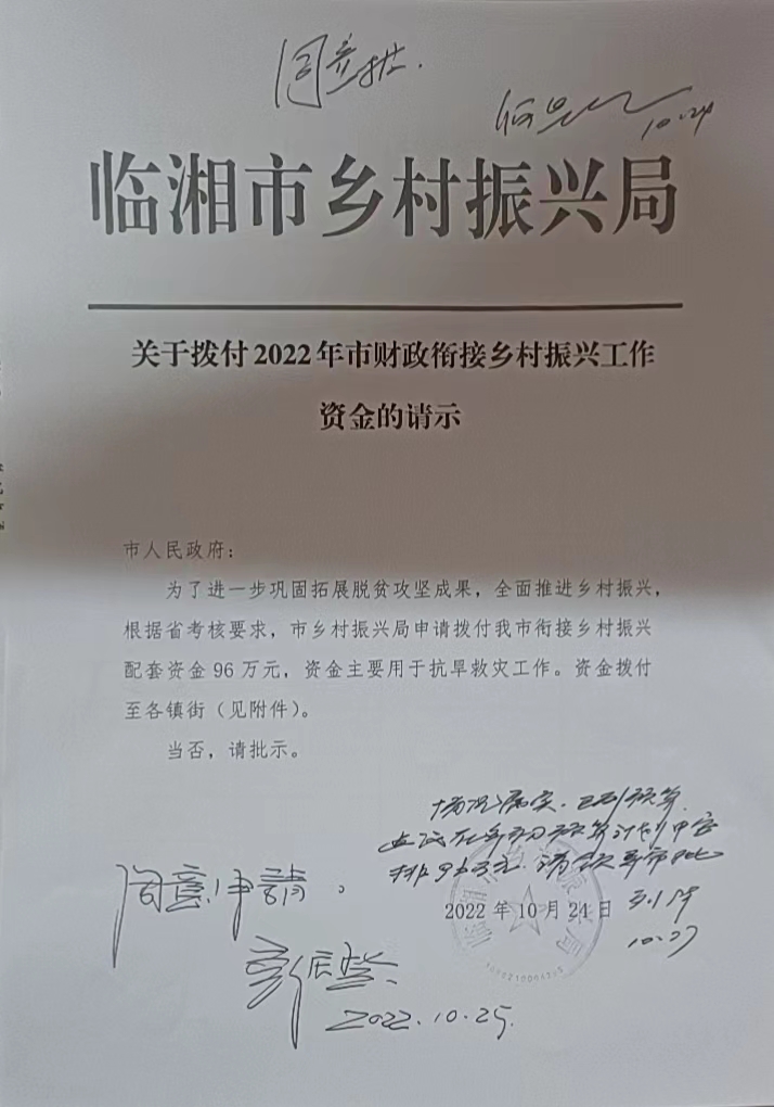 2022年临湘市县级配套乡村振兴补助资金(抗旱)