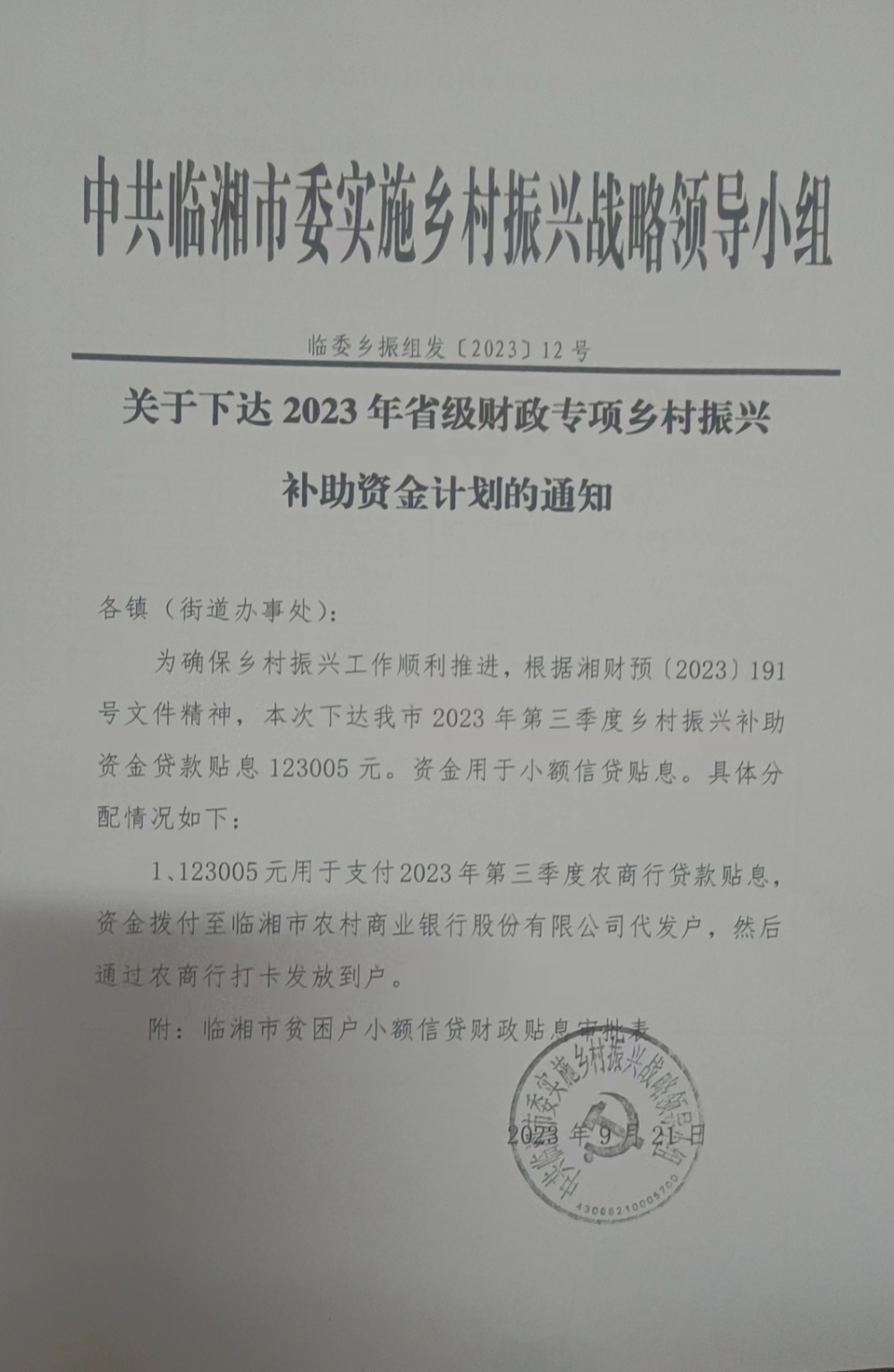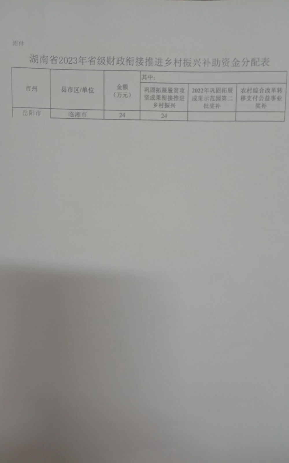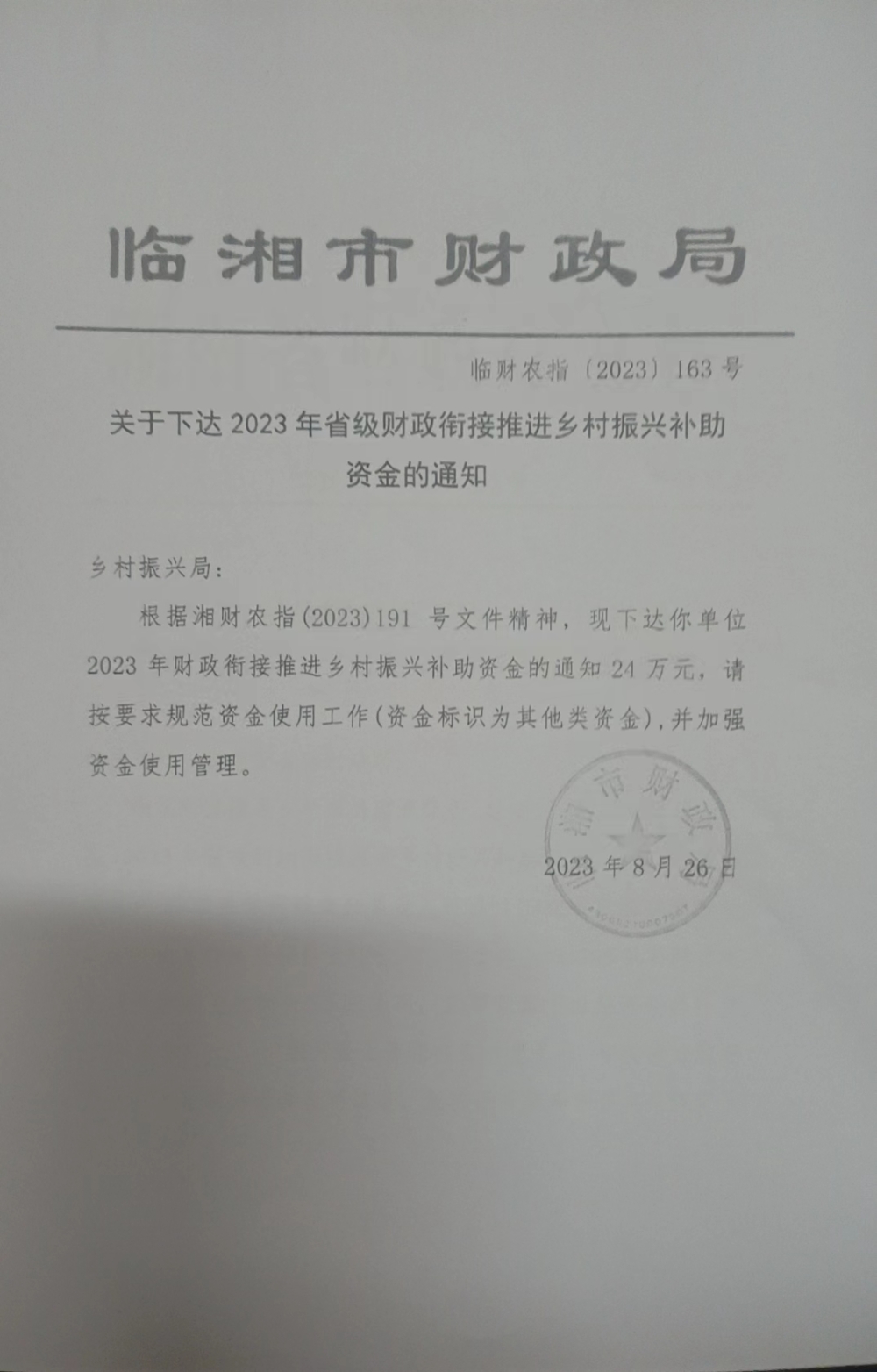 关于下达2023年省级衔接推进乡村振兴补助资金的通知(湘财预[2023]191号)