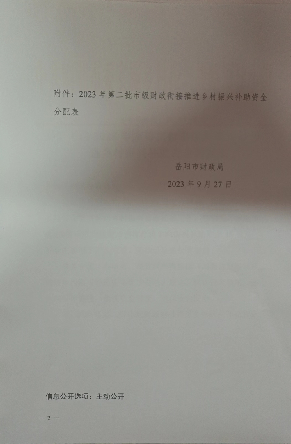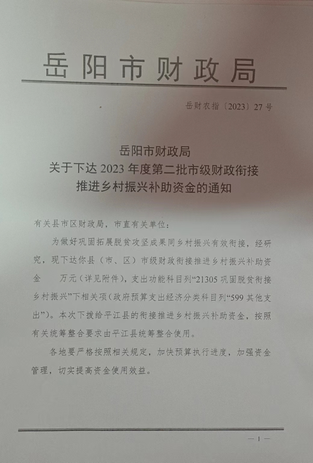 关于下达2023年度第二批市级财政衔接推进乡村振兴补助资金的通知(岳财农指[2023]27号)