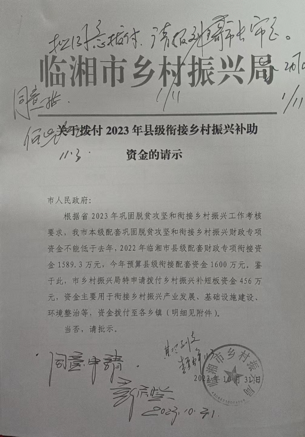 关于拨付2023年县级衔接乡村振兴补助资金的请示