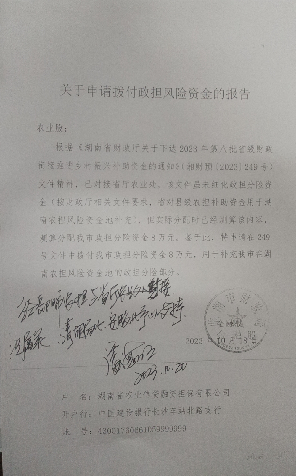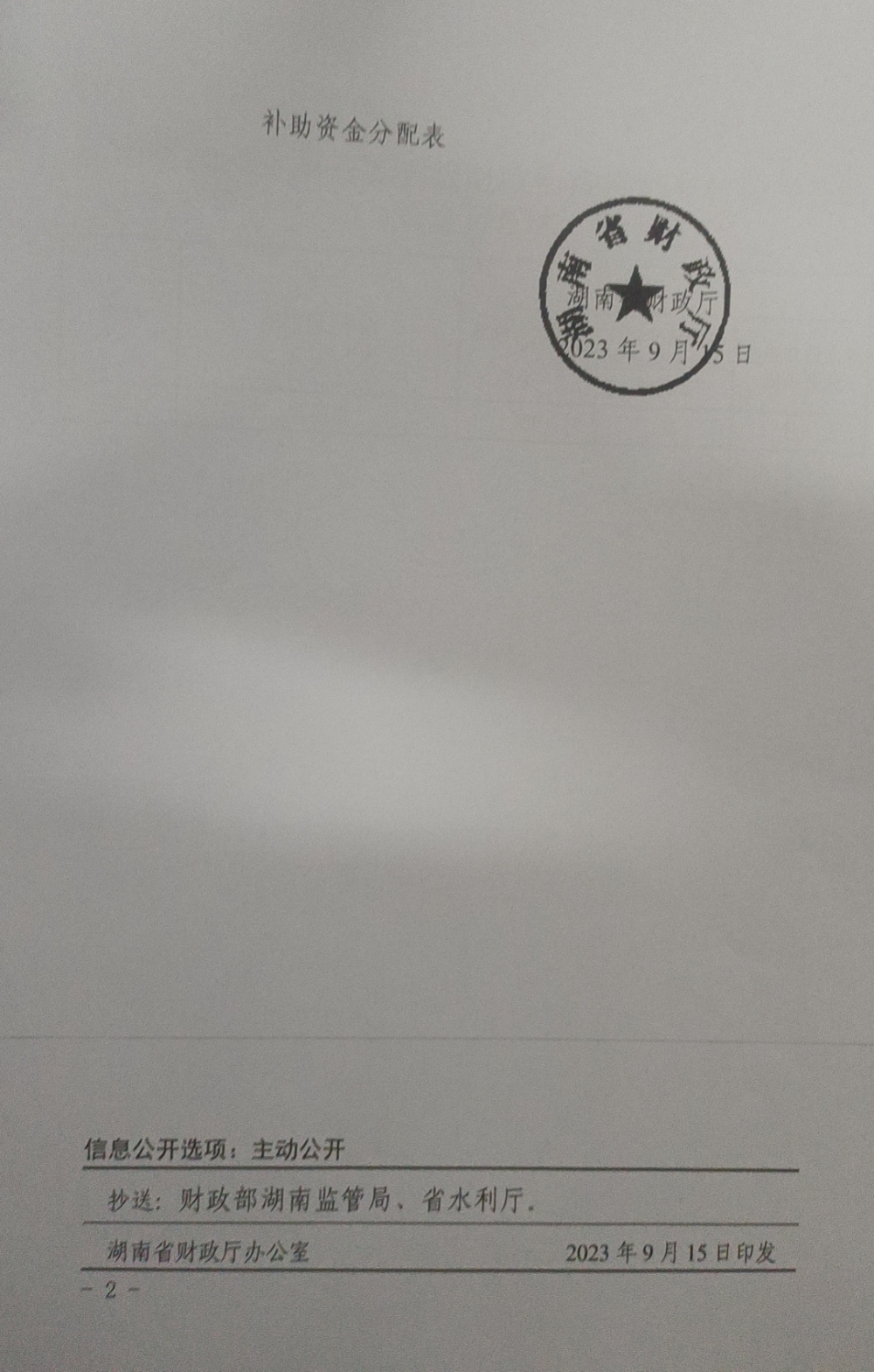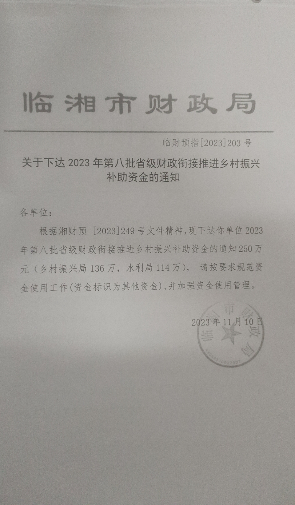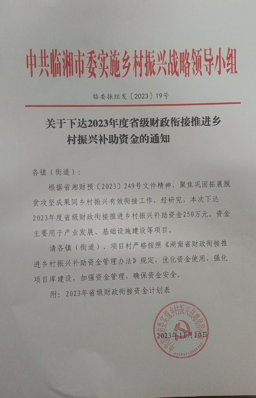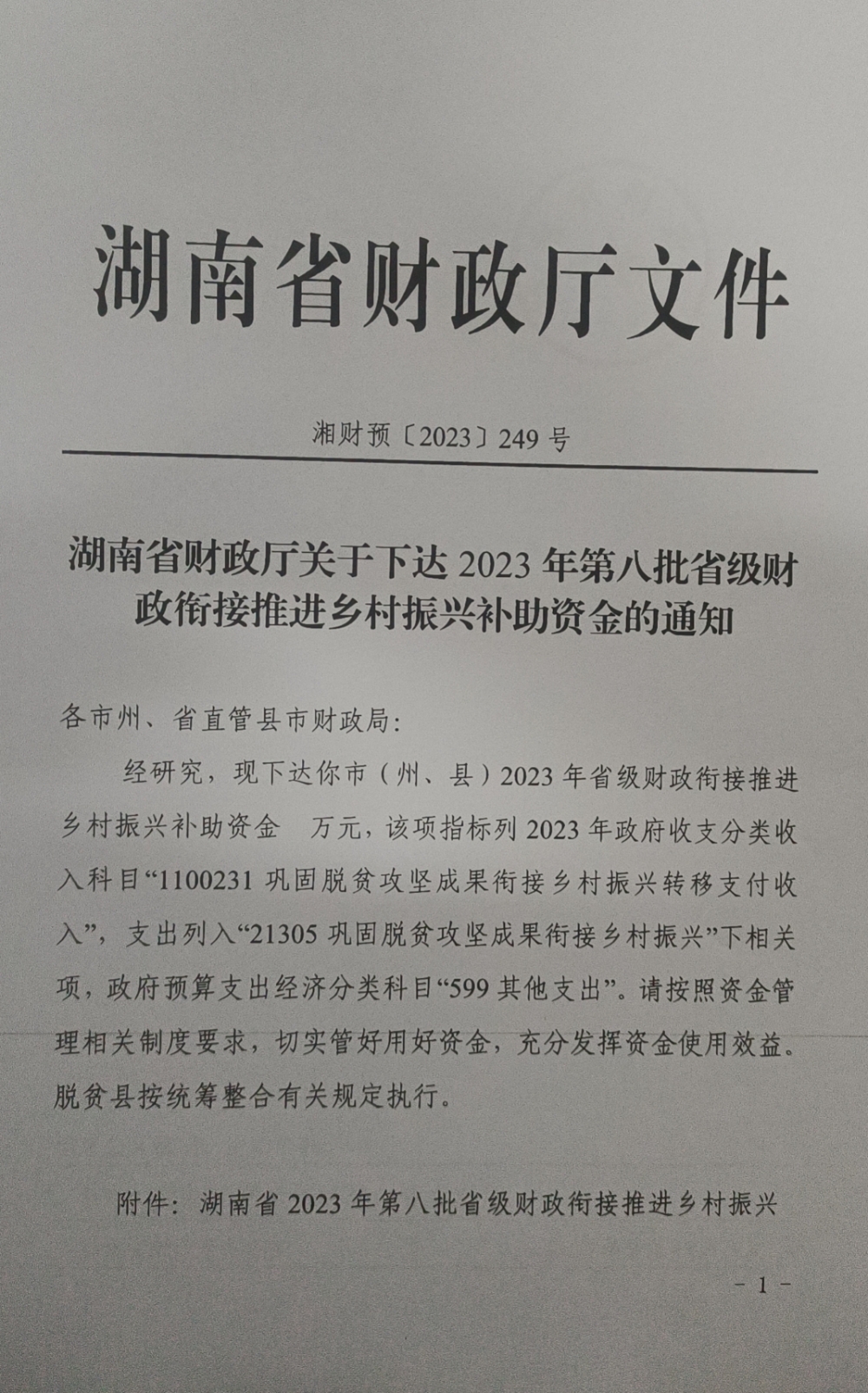 关于下达2023年第八批省级财政衔接推进乡村振兴补助资金的通知(湘财预[2023]249号)