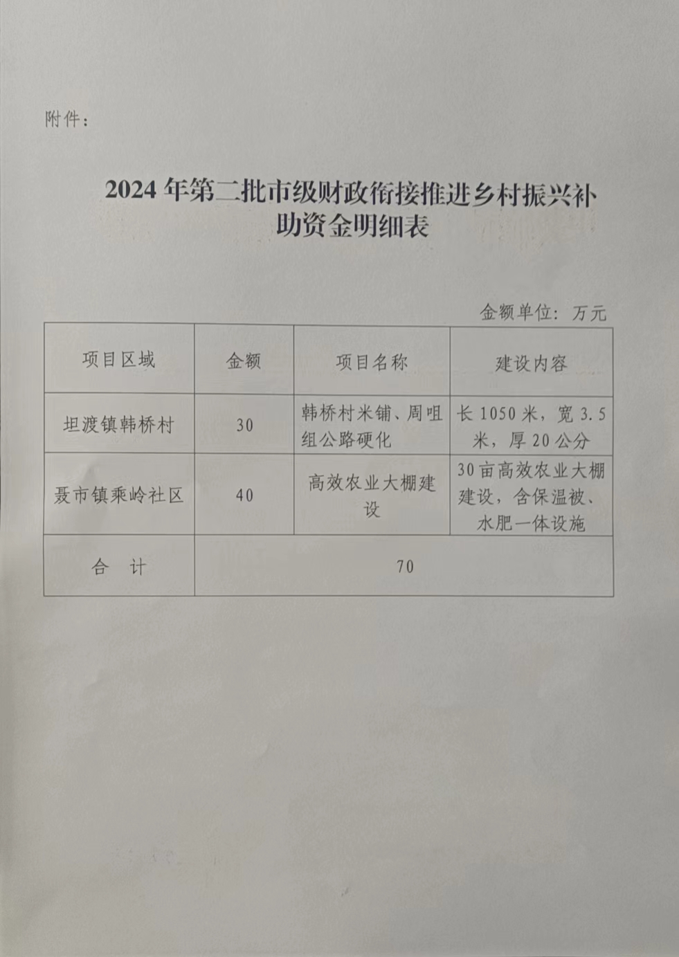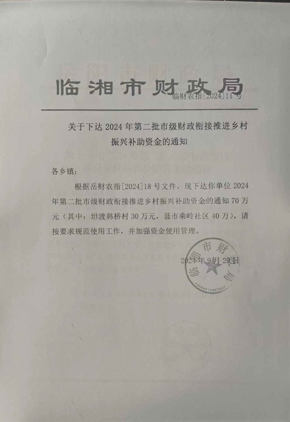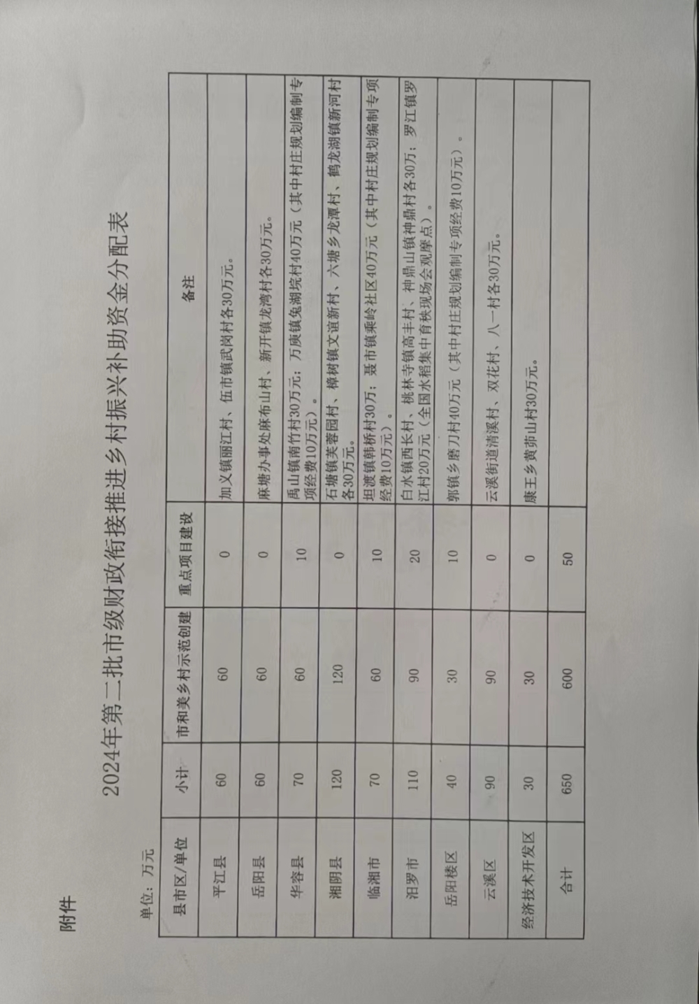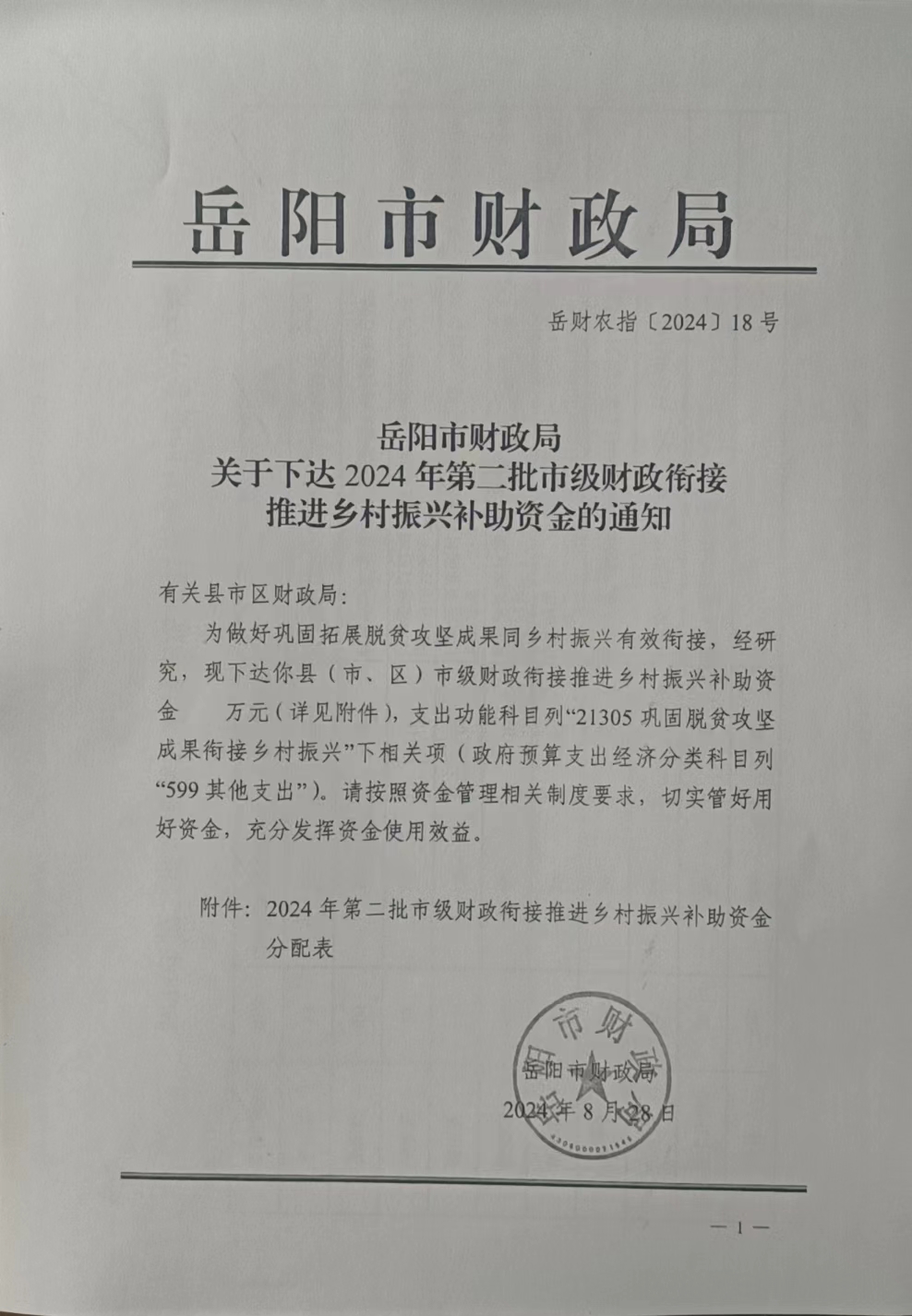 关于下达2024年第二批市级财政衔接推进乡村振兴补助资金的通知(岳财农指[2024]18号)