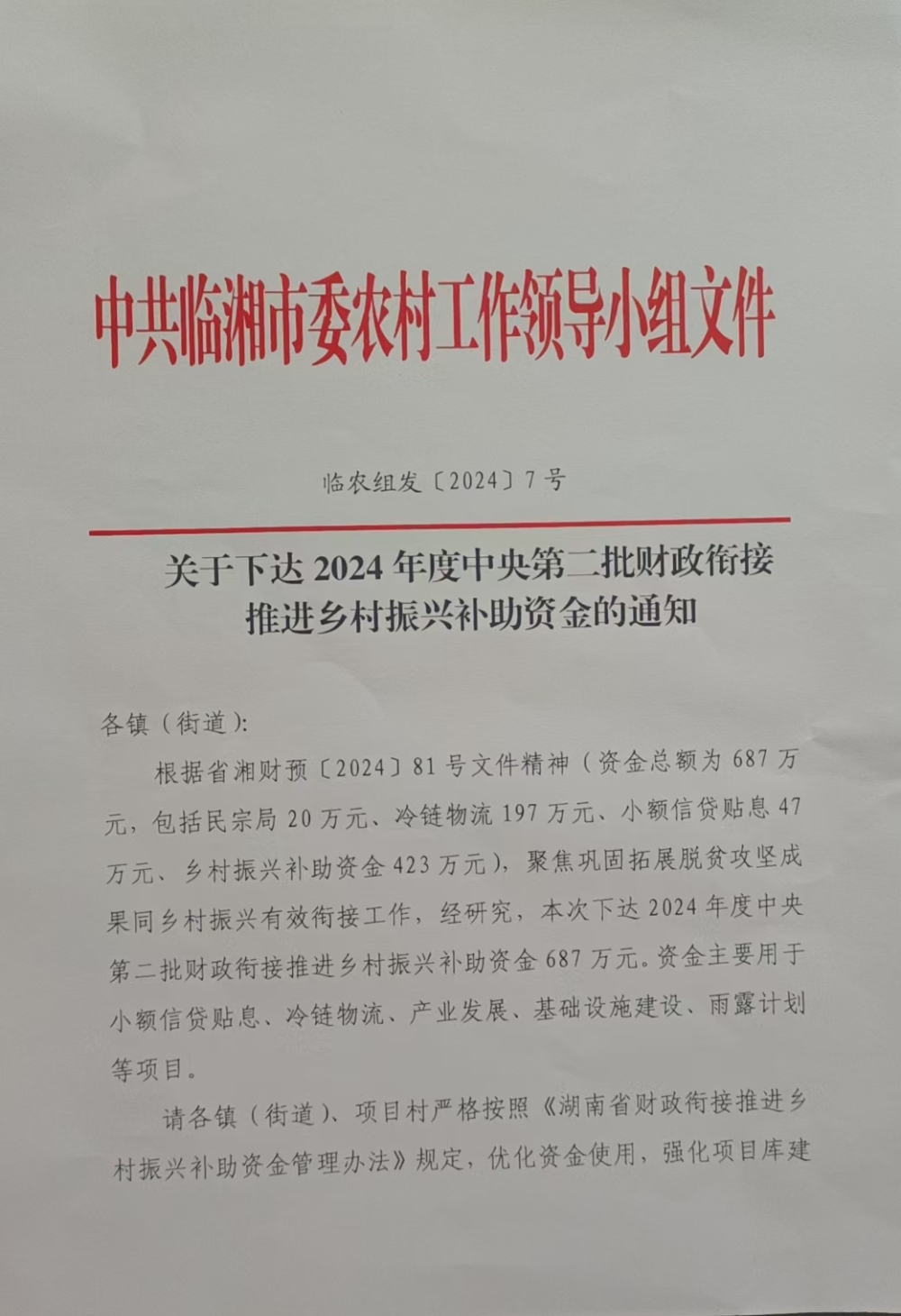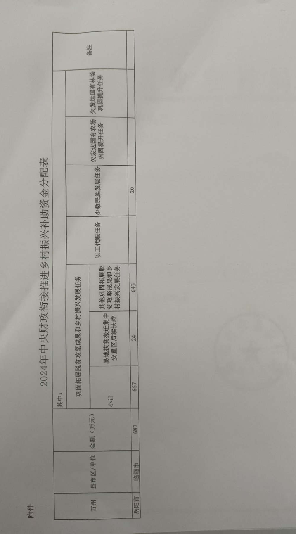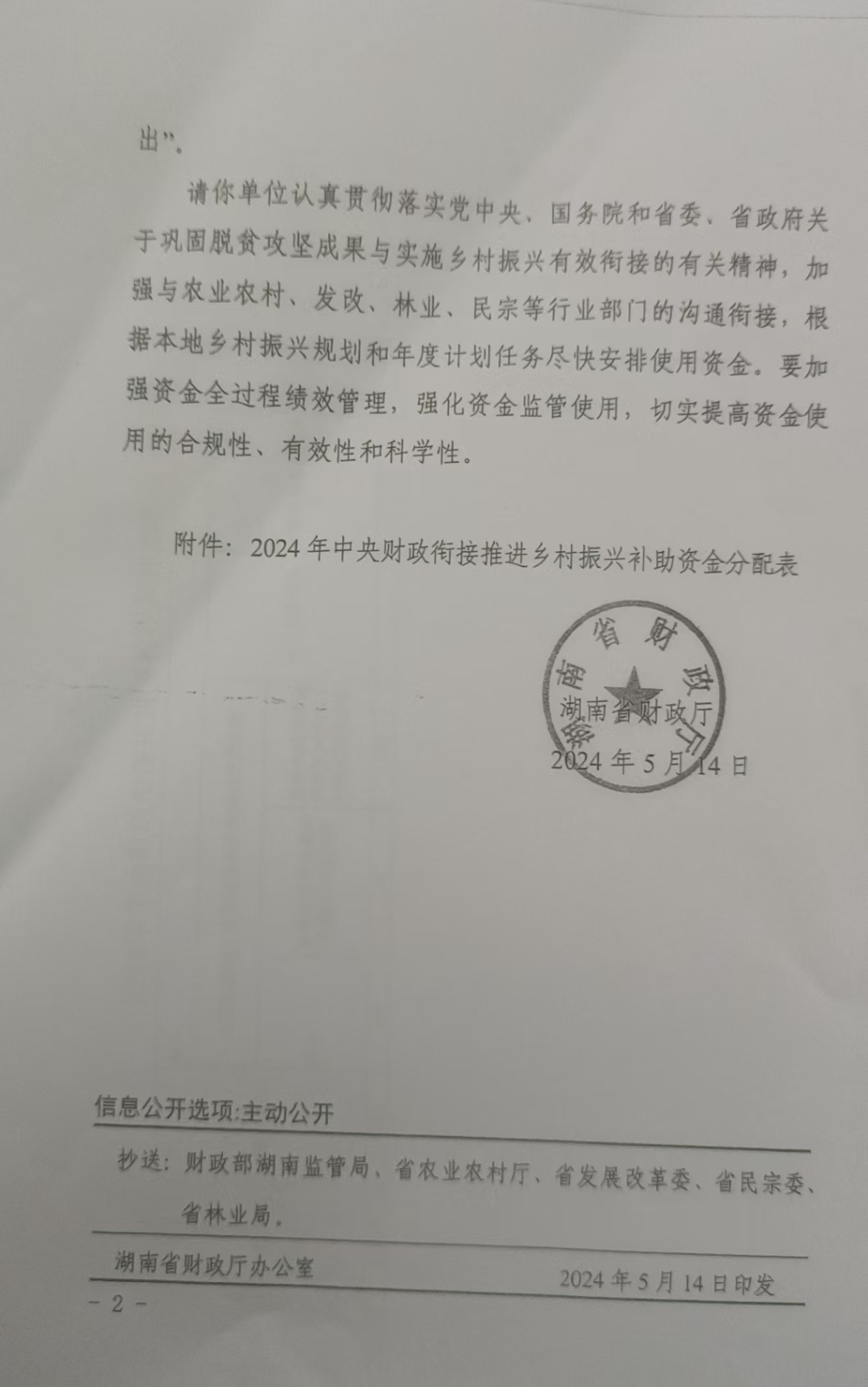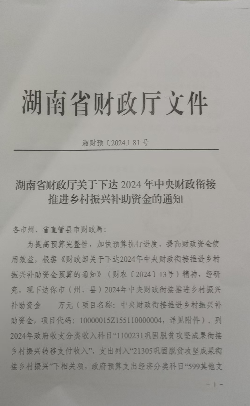 湖南省财政厅关于下达2024年中央财政衔接推进乡村振兴补助资金的通知(湘财预[2024]81号)