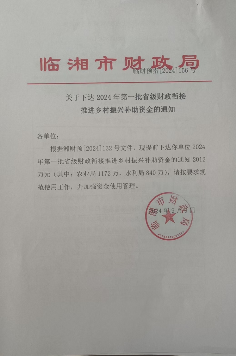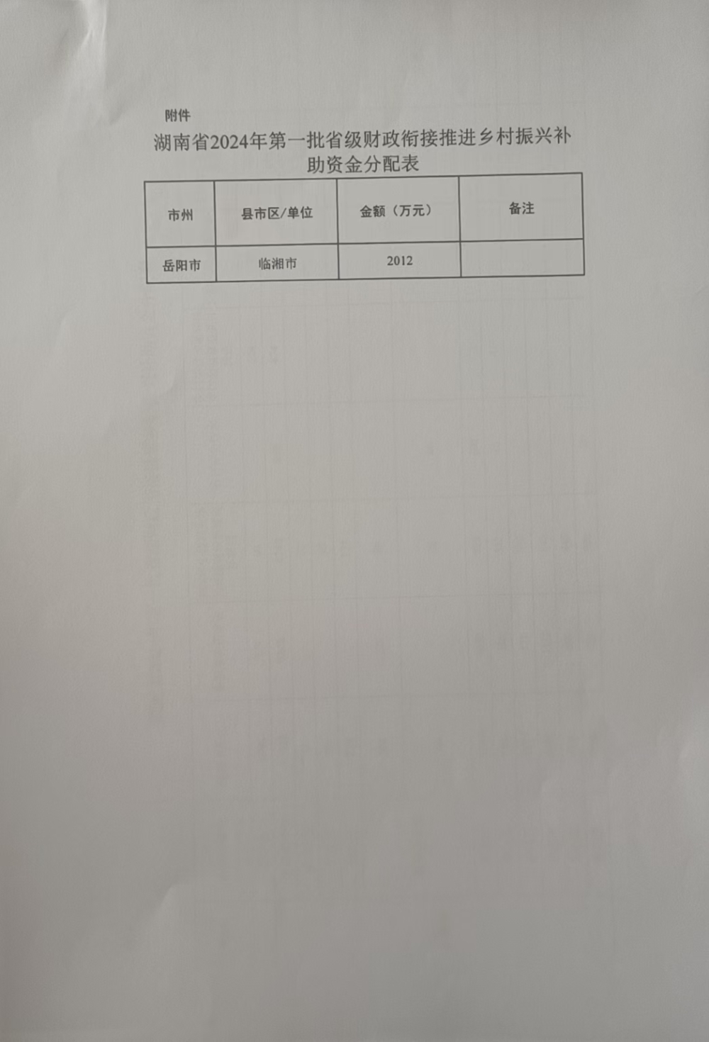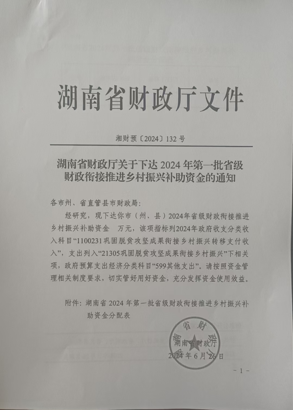 关于下达2024年第一批省级财政衔接推进乡村振兴补助资金的通知(湘财预[2024]132号)