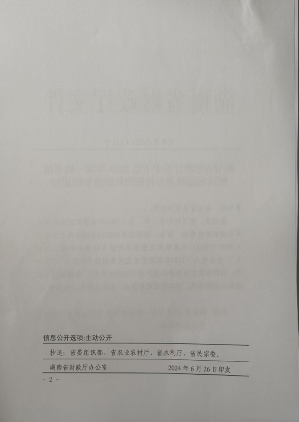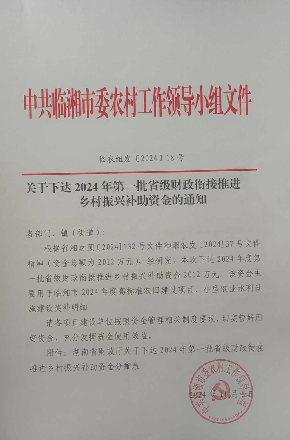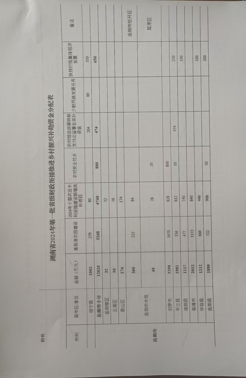 关于下达2024年第一批省级财政衔接推进乡村振兴补助资金的通知(湘财预[2024]132号)