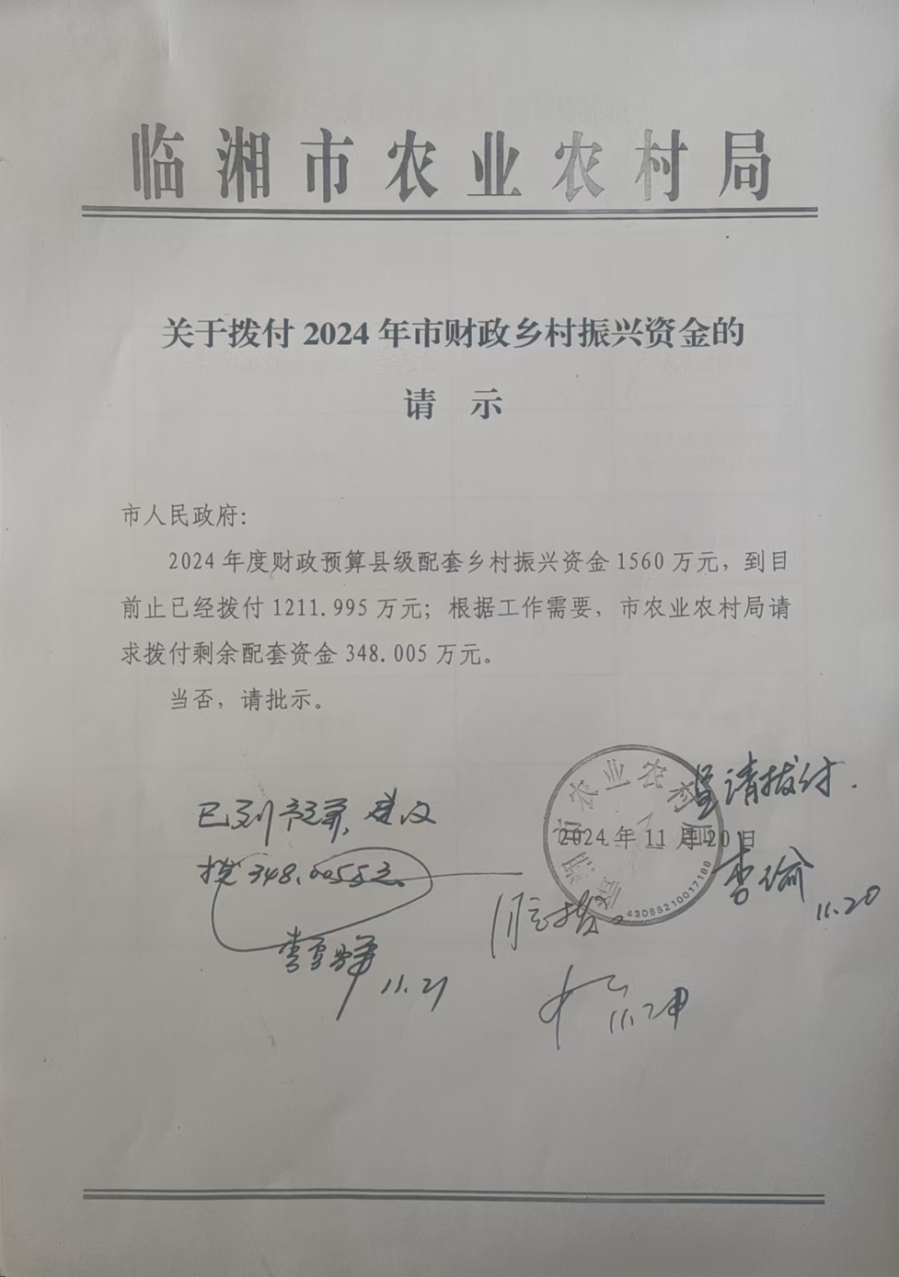 关于拨付2024年市财政乡村振兴资金的请示(县级配套7)