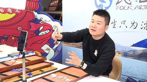 在民间艺人钓具有限公司直播间内,主播正紧扣“双十一”营销活动,在天猫、淘宝、京东、抖音等平台讲解手中的商品,与直播间的观众热情互动。