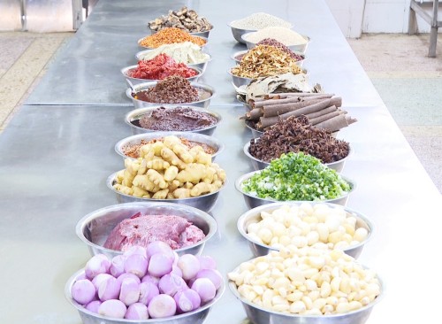 相传三国时期,东吴大将黄盖屯兵下隽县地,以“村”为建制,设十三个村,将士们在村内开荒种地,将优质蔬菜腌制后放入土坛再藏入窖中,经七七四十九天后取出,酱菜别有一番风味。为此,十三村酱菜流传至今。后人则用当地土法演变出十三村酱菜制作技艺流传下来。眼前这位正在熬制酱料的是十三村酱菜制作技艺的第四代传承人黄小霞,做好酱菜,关键在酱的熬制,发酵好的机料,要与精选香菇形成配比,放入油锅中,加入卤制黄牛肉,剩下的十几种精选香料不能一起放入,每放入一样后,要不停地搅动锅铲,待入味后才能放入下一种香料。制作者要站在灶旁不停歇地熬煮两小时酱菜才能做成。