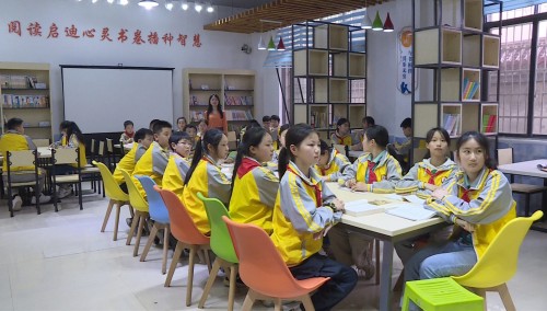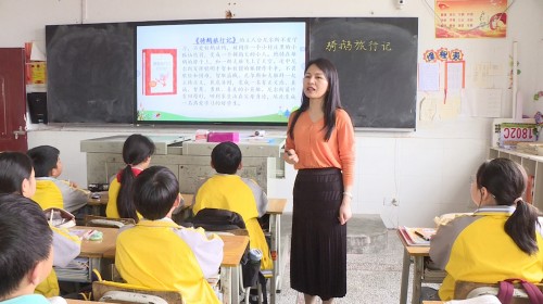 在市第五完全小学1802班阅读课上,李海荣与学生们共读《骑鹅旅行记》,分析尼尔斯在骑鹅旅行前后的变化,引导他们健康快乐成长。