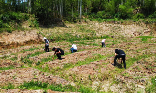 5月28日,在分水村中药材种植基地,村民们在基地技术人员的指导下,正忙着为黄精进行除草、施肥等管护工作,现场呈现一派繁忙的劳作景象。