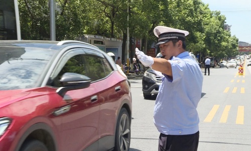 8月5日,记者在城区主要交通路口看到,执勤交警正挥动着双臂指挥车辆,在热浪中守护群众平安出行。