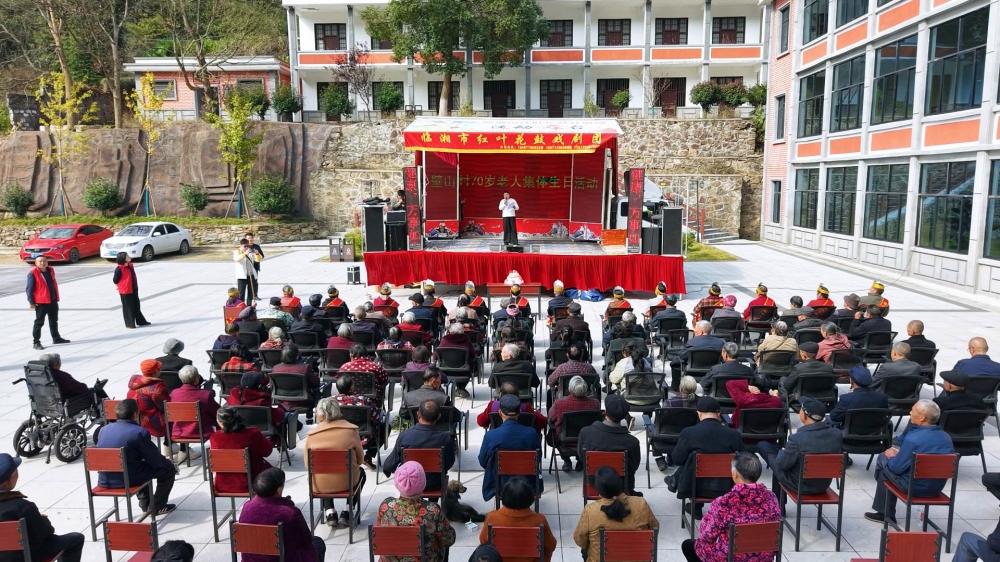 活动现场,工作人员为年满70周岁的寿星们佩戴红色绶带,大家围在生日蛋糕前,许下美好心愿,并一起拍摄“全村福”。随后,花鼓戏表演精彩上演,大家看得津津有味,现场一片欢乐祥和的氛围。在中午的寿宴上,香气四溢的饭菜暖胃更暖心,老人们围坐畅谈,其乐融融。
