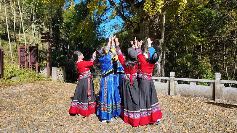 在梅池村古塘附近的茶马古道驿站遗址旁,一株高逾30米、六人方可合抱的古银杏巍然矗立。这株被当地人视为“活化石”的千年古树,相传为瑶民为躲避战乱隐居龙窖山时亲手栽种。活动当天,户外爱好者们身着瑶族传统服饰,在古银杏树下围成圆圈,伴随着悠扬的瑶歌翩翩起舞。