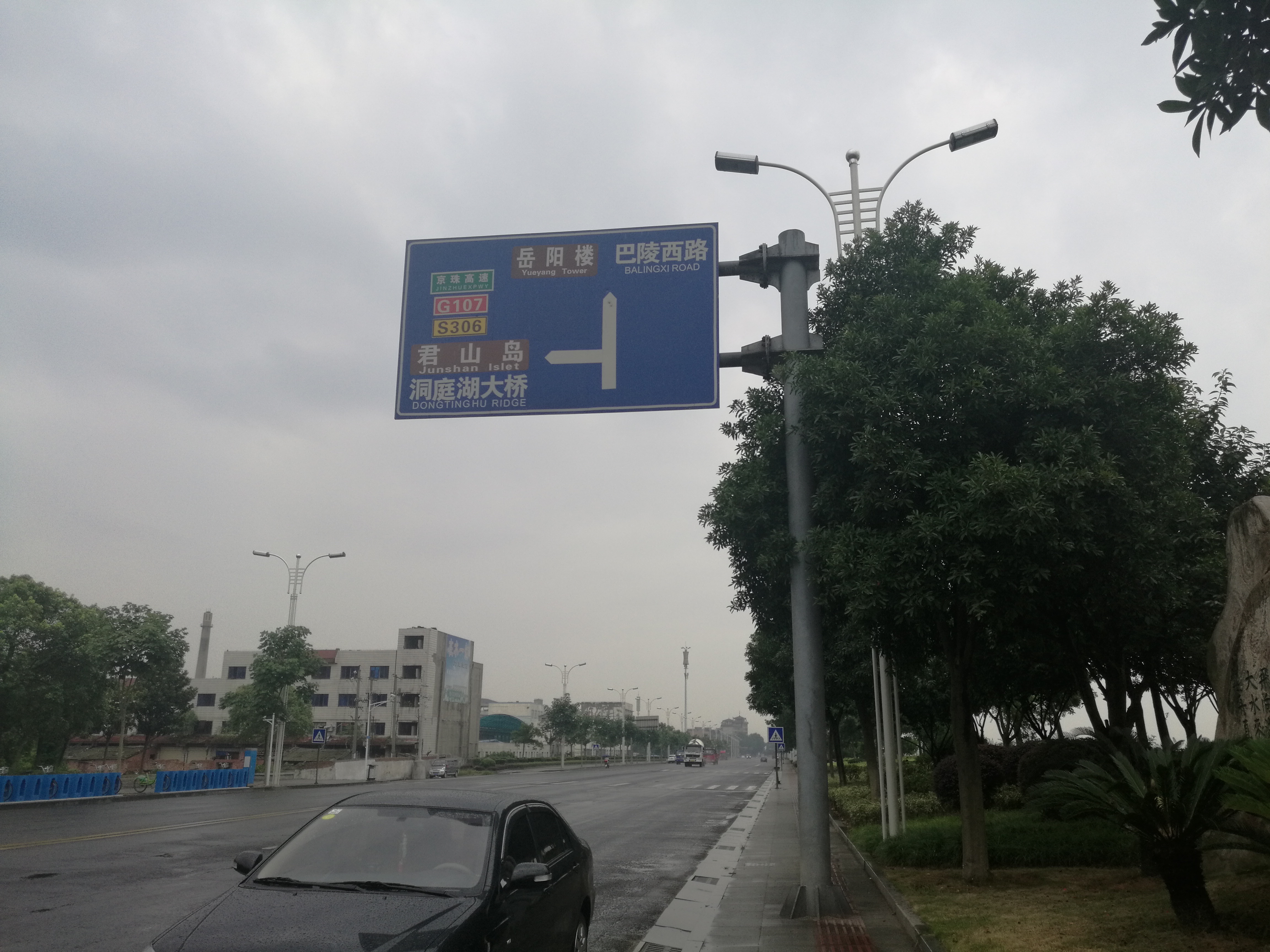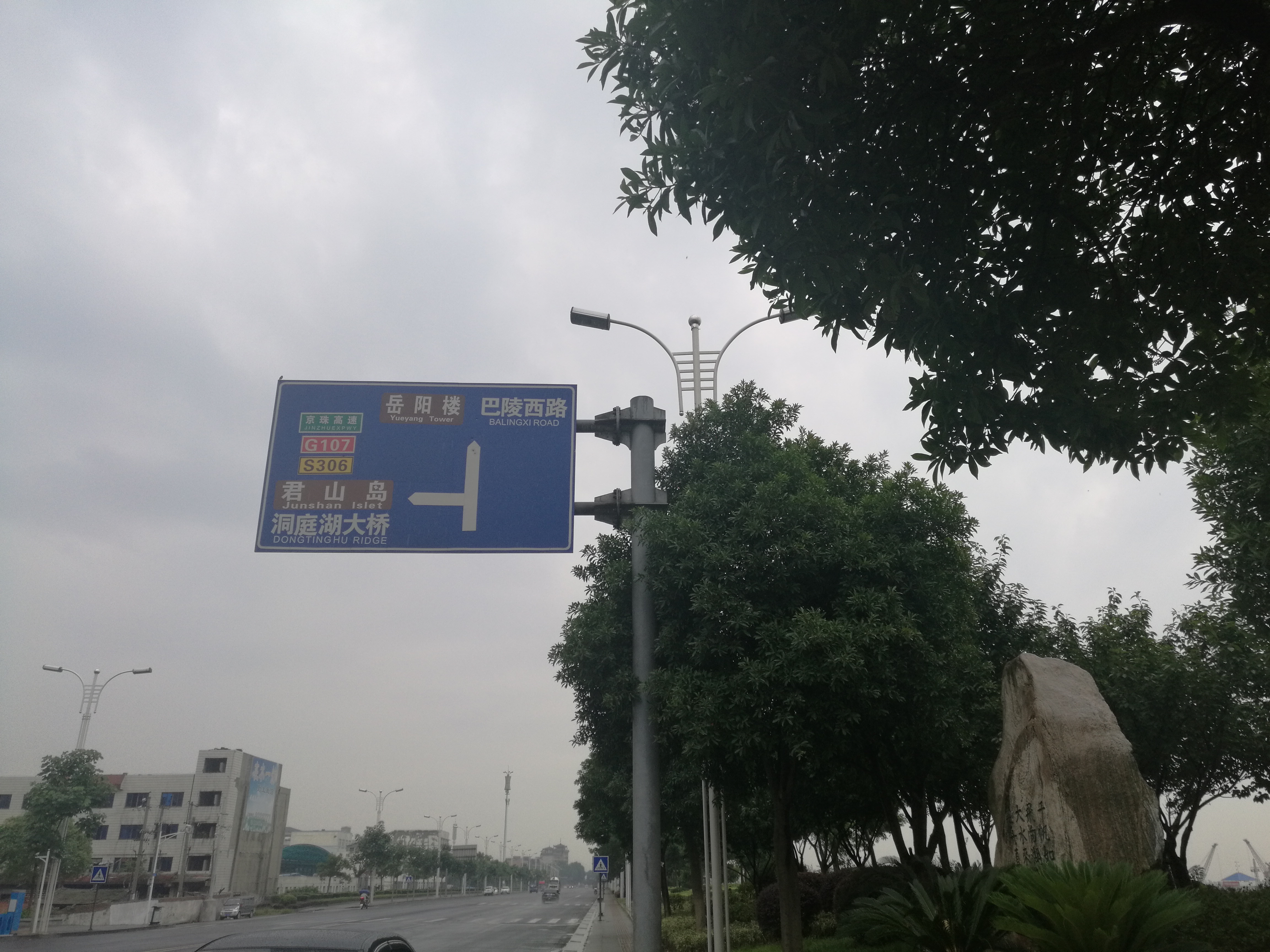 内容: 我由沿湖大道向南走,在洞庭鱼都码头不远处,看见这块路牌,把向君山、洞庭大桥的方向指向东方了。