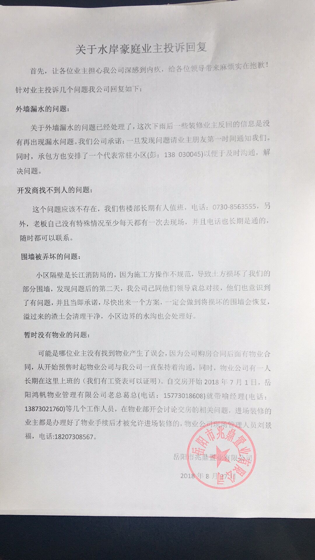 | 回复内容: | 水岸豪庭业主全体求助: 你们好!你们咨询关于水岸豪庭项目相关问题已收悉,现经市住保中心云溪区分中心核实处理后,回复如下: 收到来信后,工作人员立即与该项目开发商岳阳市兆鼎置业有限公司负责人联系,要求开发商针对你们提出的问题认真核实处理。现将开发商的回复(见附件)转发给你们,如仍有疑问,可以再次与市住保中心云溪区分中心联系,联系电话:8412288.。 感谢你们对我市住房和城乡建设工作的支持和关心,祝你们生活愉快! |