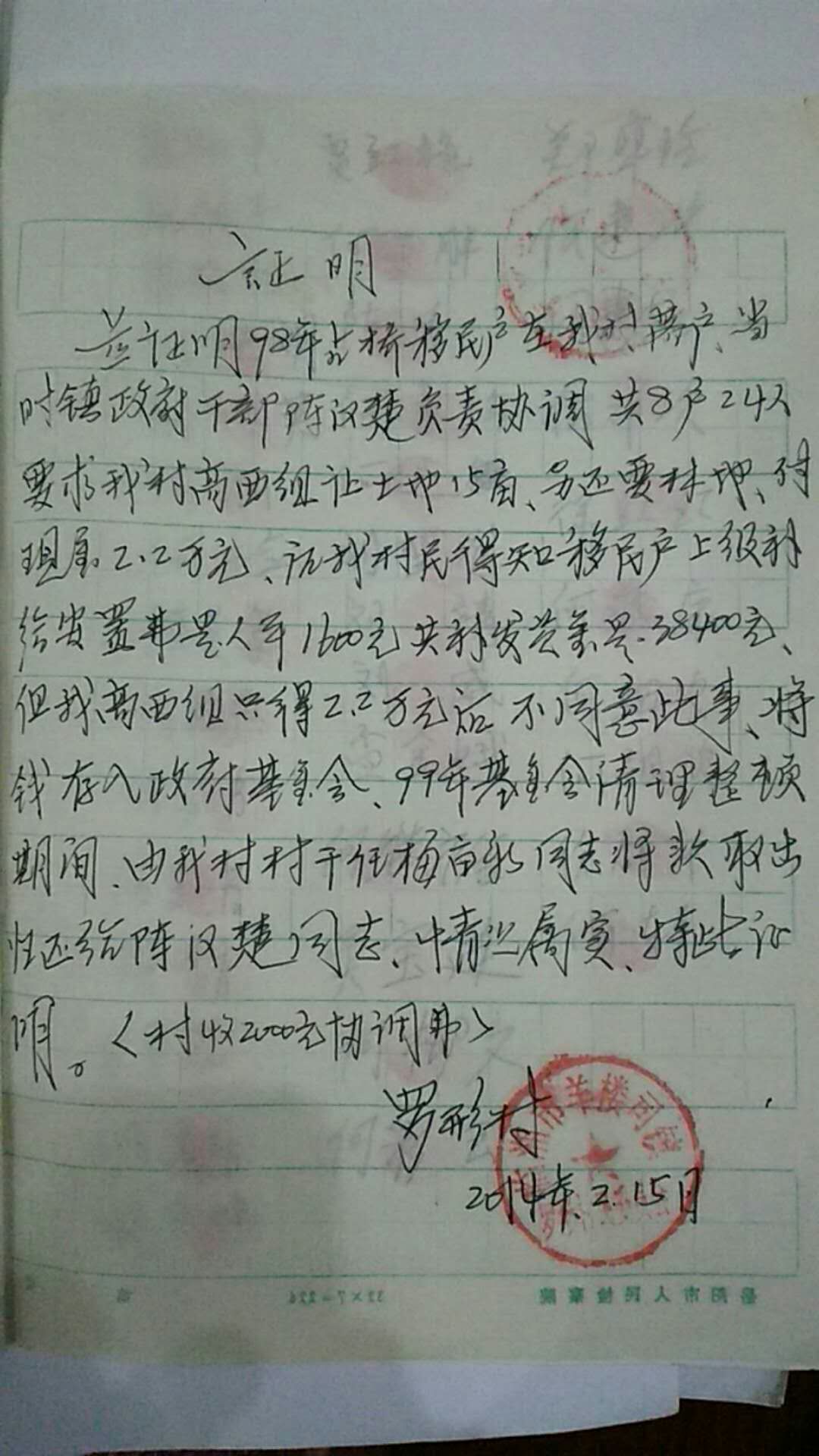 感谢您在百忙之中看这封信,我们原本是詹桥镇水泉村堤坝组村民。1998年,因修团湾水库,我们外迁落户到本市羊楼司镇罗形村高西组,当时我们共8户24人,每人落户费1600元,24人共计38400元。此时负责协调移民工作的镇干部陈汉楚对此事不仅不负责,反而挪用我们的落户费16400元,只向罗形村村委支付22000元落户安置费(即购买林地、田地的费用,见该村证明)。由于陈汉楚未及时付清剩下的16400元,导致罗形村不给我们落户。