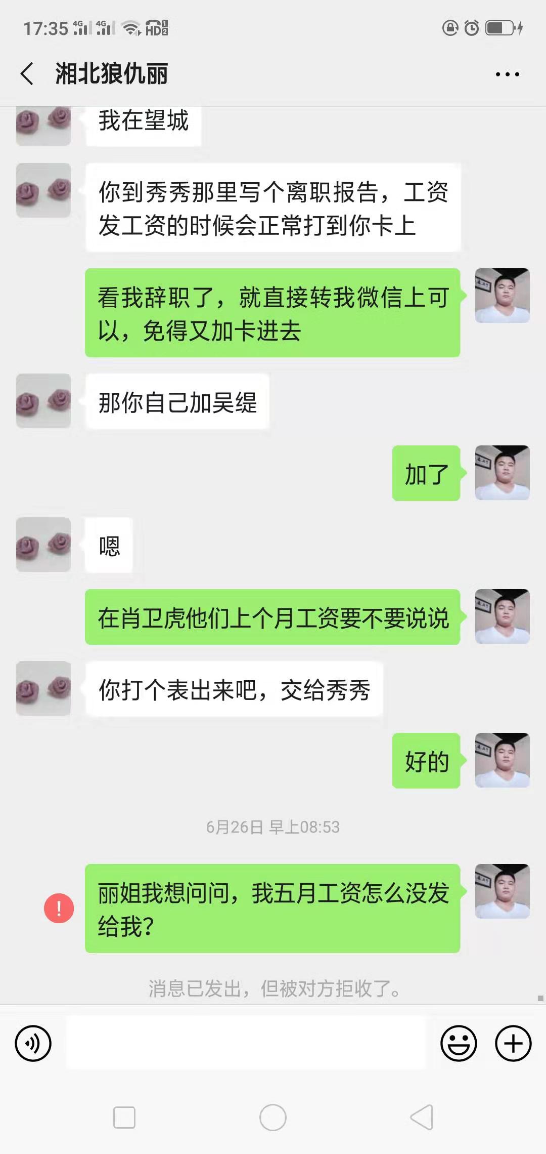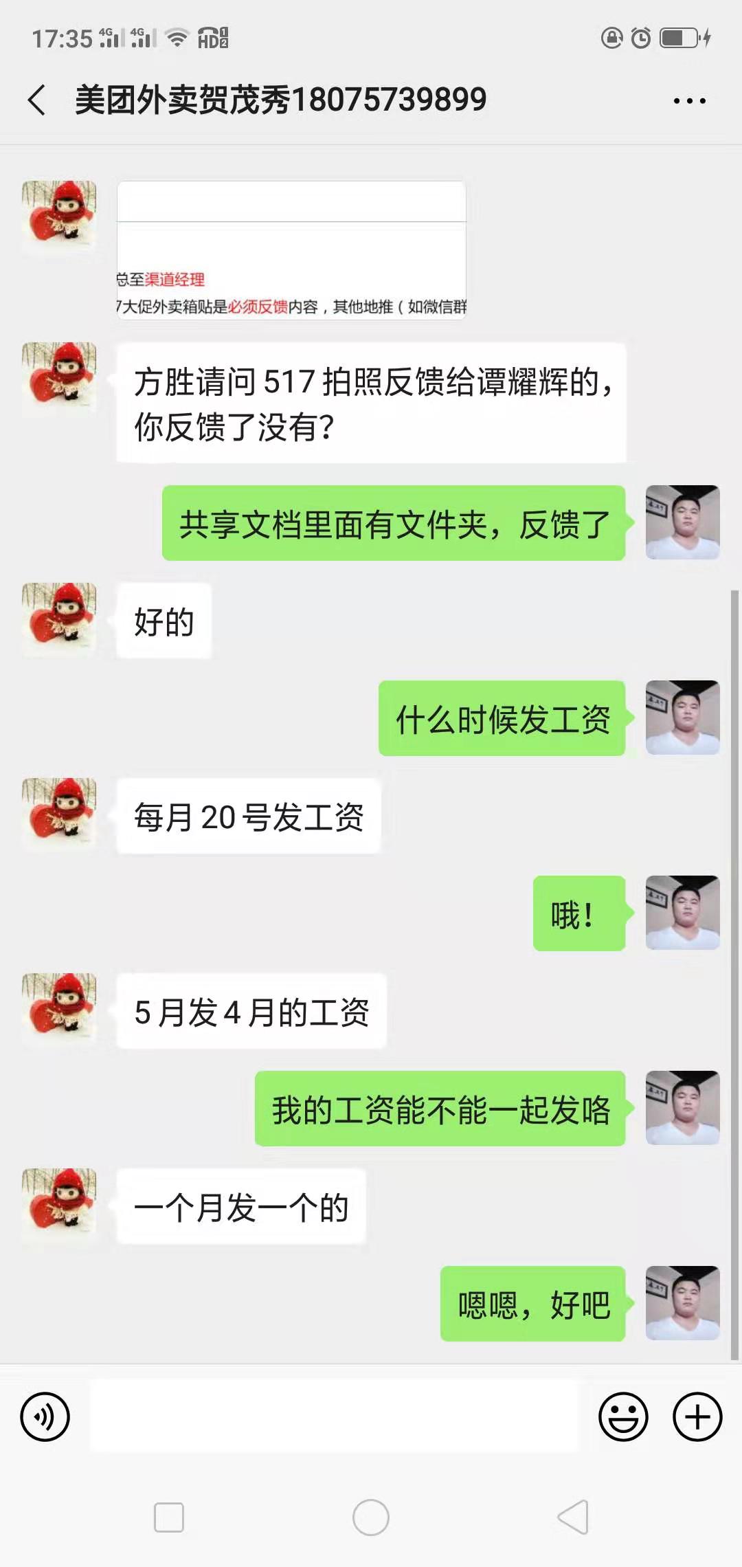 本人是2月21日入职美团外卖,薪资协定也是口头协议,没签劳动活动。工资是6500元一个月,拖欠我半个月工资长达两个月。在公司讨个说话,直接让我去劳动局告,极其嚣张。然后我多次去劳动局确得不到解决,同时我也打了投诉电话12345也得不到解决,去劳动仲裁然后让去劳动监察让我登记备案,但是到目前都没有回应,我只想要我应得工资,不签劳动合同本身就是违反法规,恳求政府部门给予解决!感谢各位领导关注! 附件1:1.jpg 附件2:2.jpg 附件3:3.jpg 附件4:4.jpg 附件5:5.jpg |