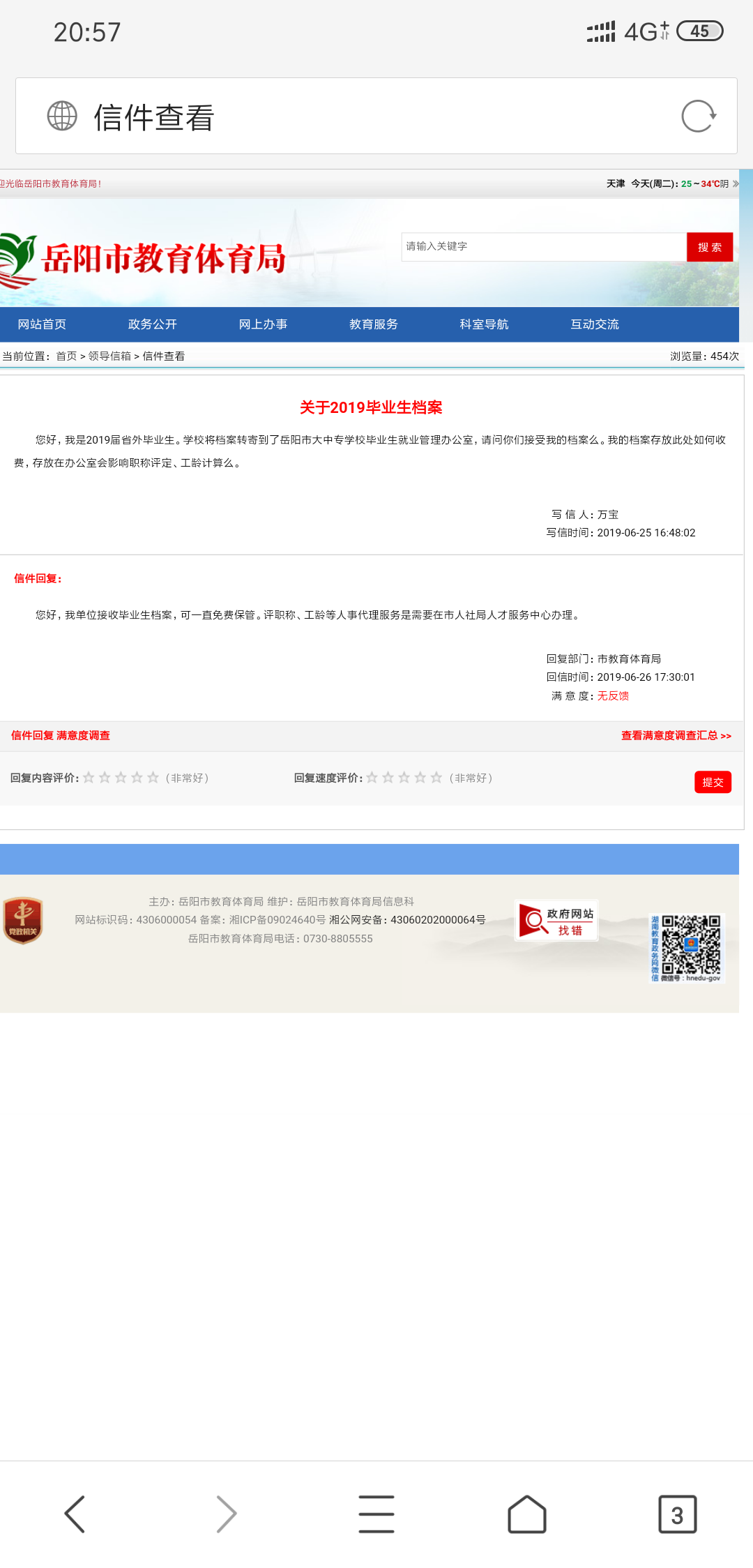 | 内容: | 您好,岳阳市教育体育局官网说 您好,我单位接收毕业生档案,可一直免费保管。评职称、工龄等人事代理服务是需要在市人社局人才服务中心办理。