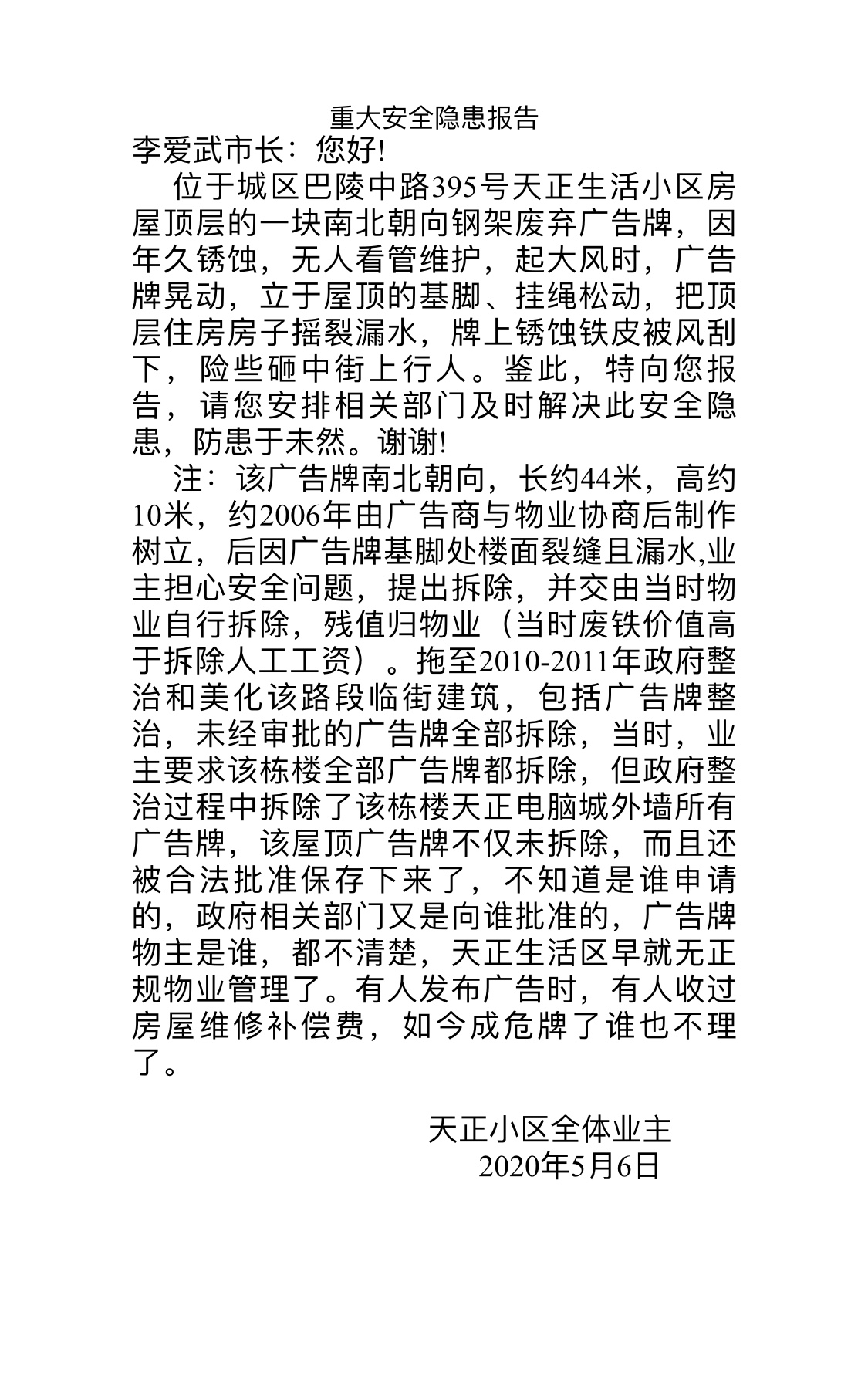| 标题: | 天正生活小区重大安全隐患报告 |