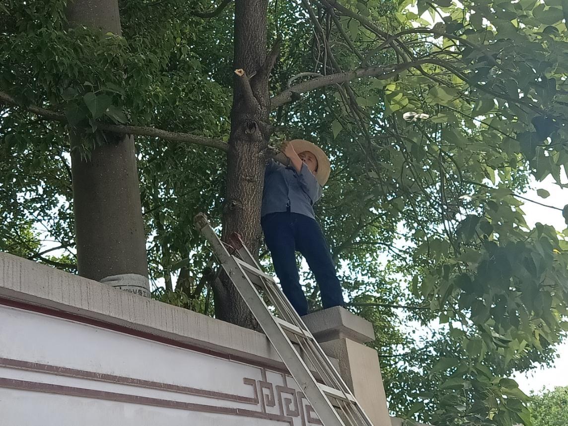 (工作人员对道路两旁树枝进行修剪) |