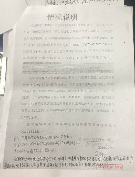 | 内容: | 市长先生,你好!百忙之中打扰,实在抱歉!但如果不反馈上来,又无人积极处理!可能在你们眼中是很小很小的一件事情,但在我家人及我的心中却是至关重要的!好了,长话短说!先把事情的经过简单的说一下。我是今年7月底在苏宁易购网购下的订单,8月2号由汨罗市财富广场苏宁店将我网购的洗衣机送至我家,当时买的海尔洗衣机未开发票,只给我们开了一个购机证明。等购机证明开具后,我家人才拆封洗衣机使用。但洗衣机却故障连连。多次致电苏宁客服反馈,却无任何进展。最后还是和海尔厂家联系,海尔售后服务上门维修换了一大堆零件后,才能正常使用!之前也已和市民热线反馈过,汨罗市相关部门也来过电话。但都未有实质性进展!我写这封上访信希望有以下几个实质性进展: 1.给我们网购的这台洗衣机开具发票; 2.苏宁易购必须给消费者,也就是我或我家人道歉,道歉的形式可以是当面道歉或者书面道歉,但书面道歉需盖公章。不接受电话道歉。 3.作为平凡也普通的消费者的我们为什么维权这么的心酸艰难,希望得到相关部门的重视!附:网购的洗衣机是七月底下的订单,购机证明是16年8月2号开具的。到今天已三个多月。这段时间已经害的我和家人为了这破事吵架好几次,如这次上访未有实质性进展和满意的答复,我只能用我自己的办法采取行动。我会在17年来临时亲赴汨罗财富广场店来一个爆炸性大事件。望市长先生重视,尽快给一个满意的答复。