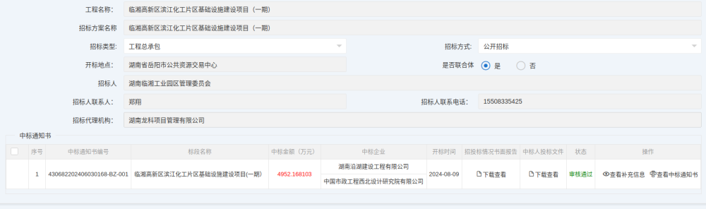 临湘高新区滨江化工片区基础设施建设项目(一期)中标通知