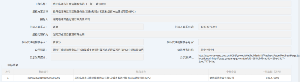 岳阳临湘市江南运输服务站(三级)及城乡客运村级首末站建设项目(EPC)中标结果公告