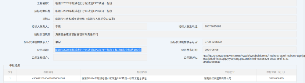 临湘市2024年城镇老旧小区改造EPC项目一标段工程总承包中标结果公告